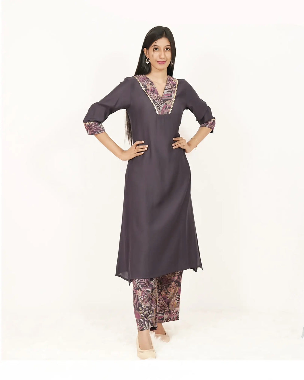 A chic and elegant cotton silk co-ord set in deep purple grey, featuring a floral printed neckline and sleeve hem highlighted with lace. Paired with a straight-fit bottom in matching floral prints, this outfit is perfect for both casual gatherings and semi-formal occasions.