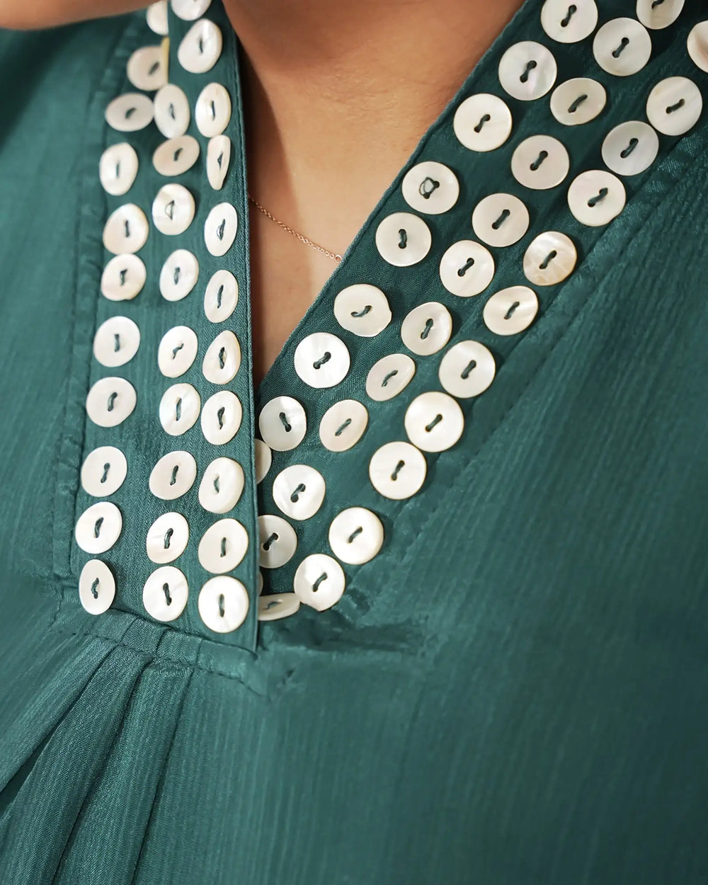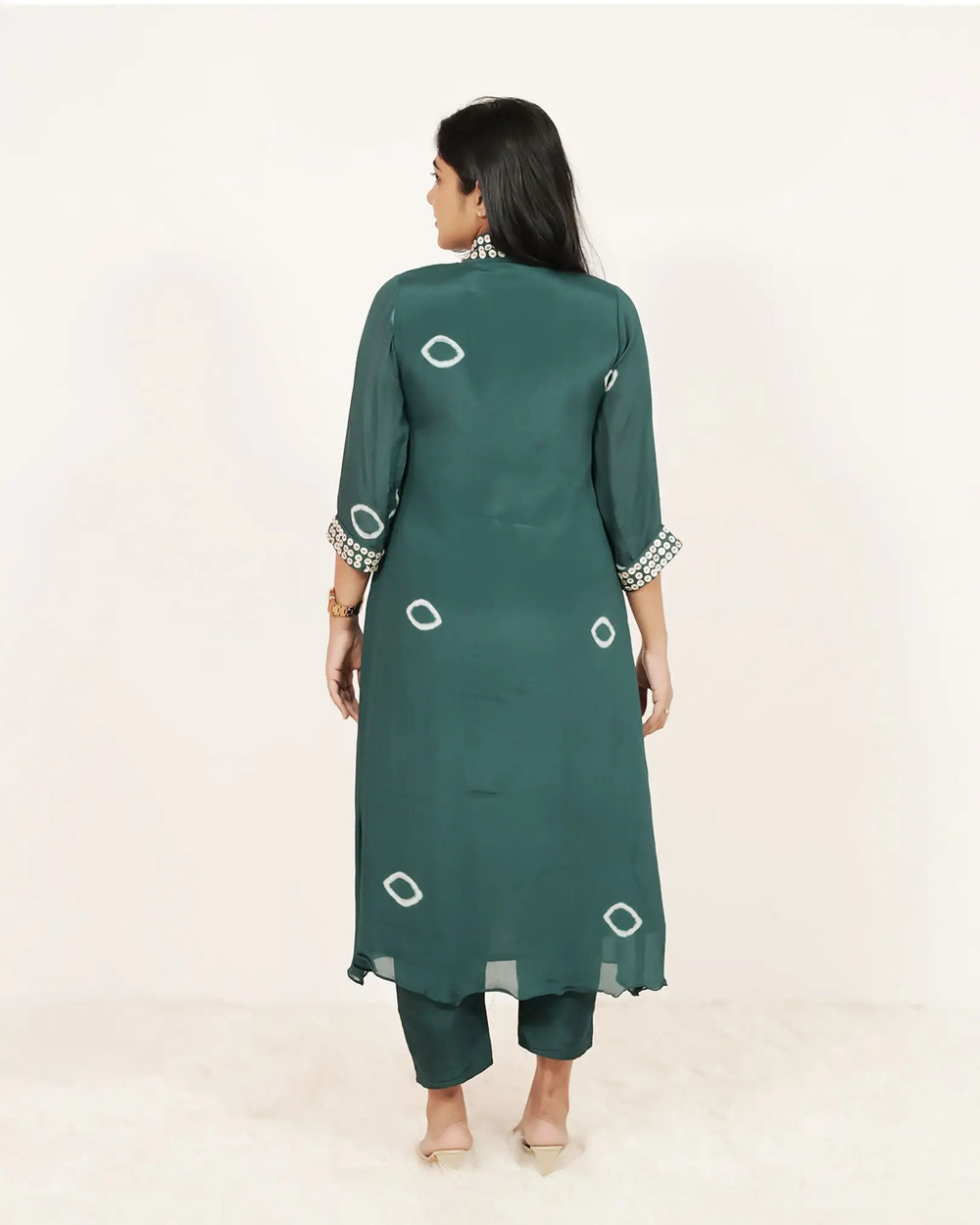 A graceful peacock green Anarkali crafted from pure chinon in an A-line silhouette, featuring elegant center pleats and stylish show button accents. Paired with a matching peacock green cotton silk normal fit bottom, this set blends sophistication and comfort for festive occasions.