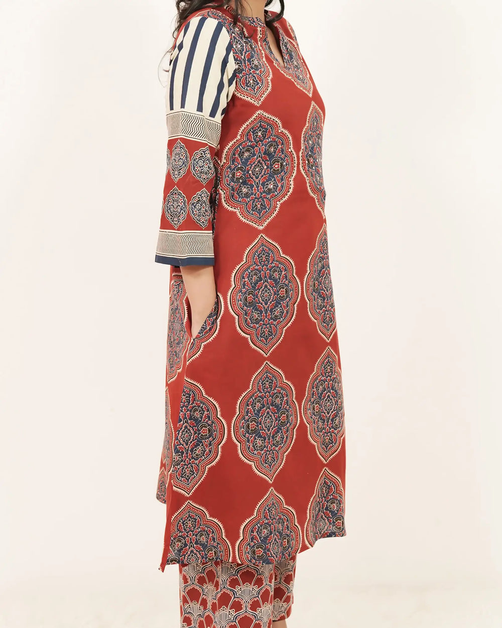 Brick red cotton salwar suit crafted in an A-line silhouette with traditional Ajrakh prints and side slit styling. Paired with matching brick red cotton Ajrakh-printed palazzo bottoms and a multicolored cotton dupatta showcasing classic black, blue, and beige Ajrakh motifs. Finished with a smart mandarin collar neckline and fine stitch detailing for everyday elegance.