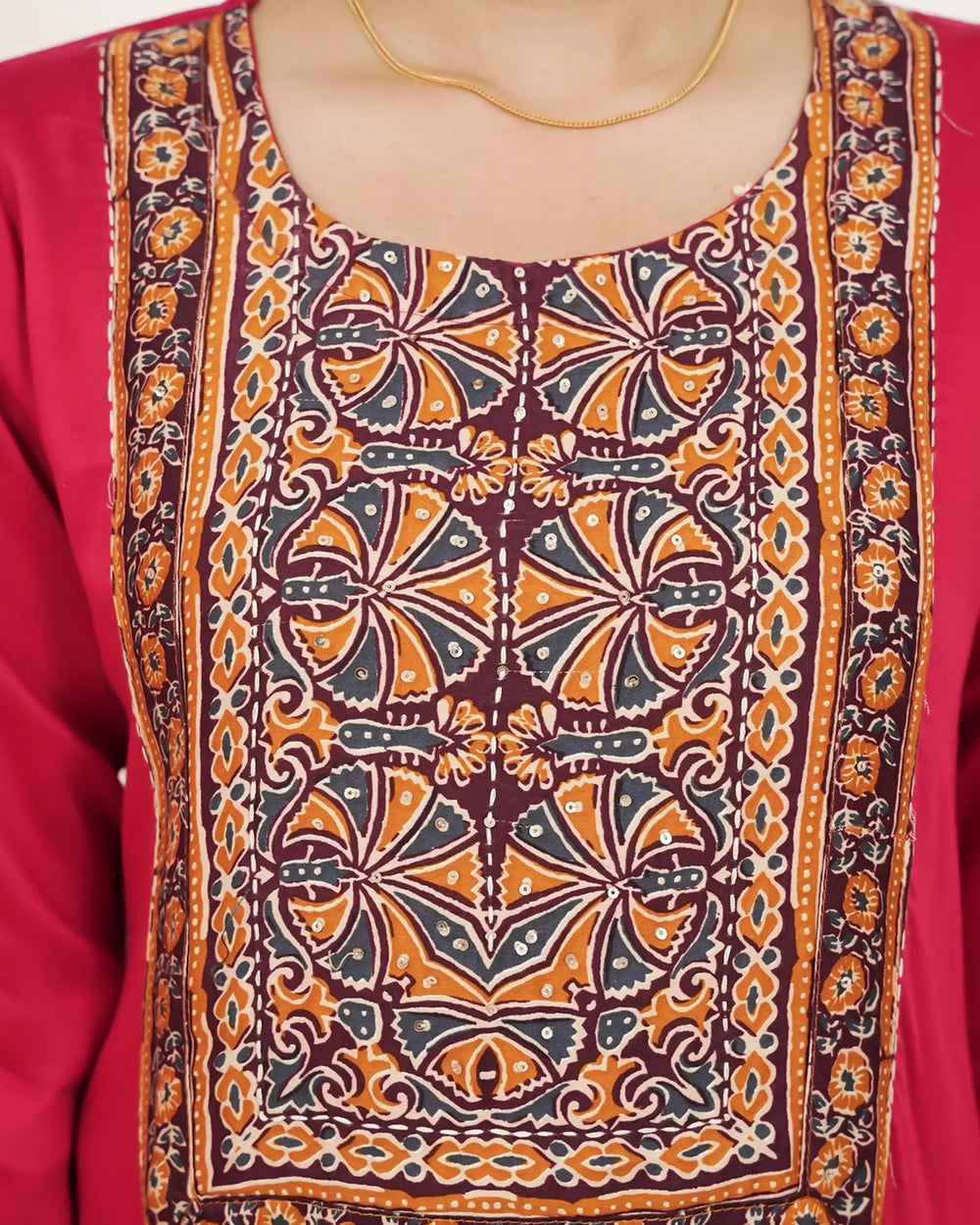 Elegant semi party wear salwar suit in pink red modal muslin, styled with an Ajrakh printed yoke and rolled sleeve hems. Paired with a matching modal muslin normal-fit bottom featuring two practical side pockets, and a coordinating Ajrakh printed modal muslin dupatta. Finished with a round neckline, plain, top stitch, and overlock craftsmanship, enhanced by minimal sequin work for a festive shine.