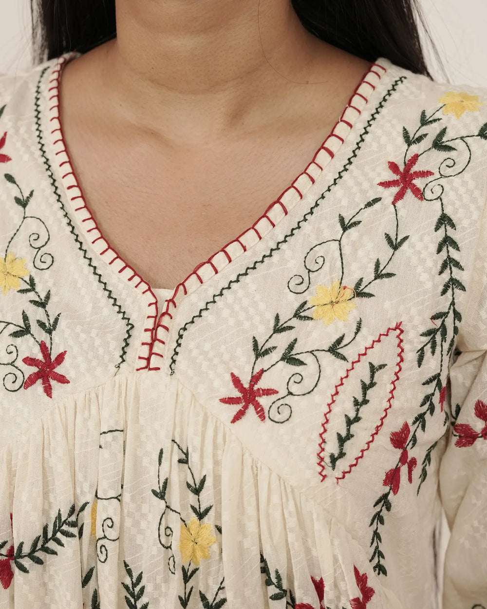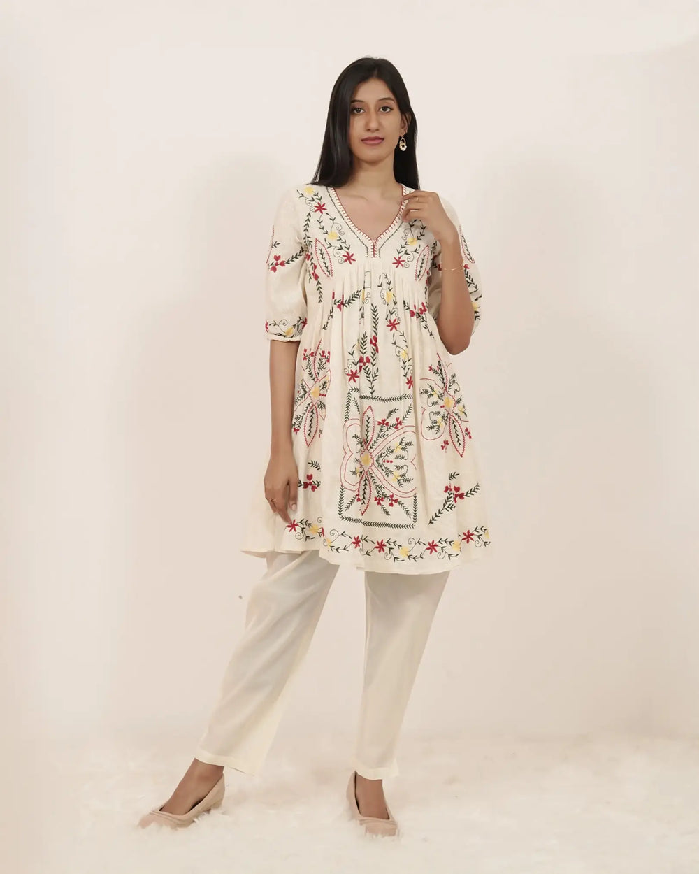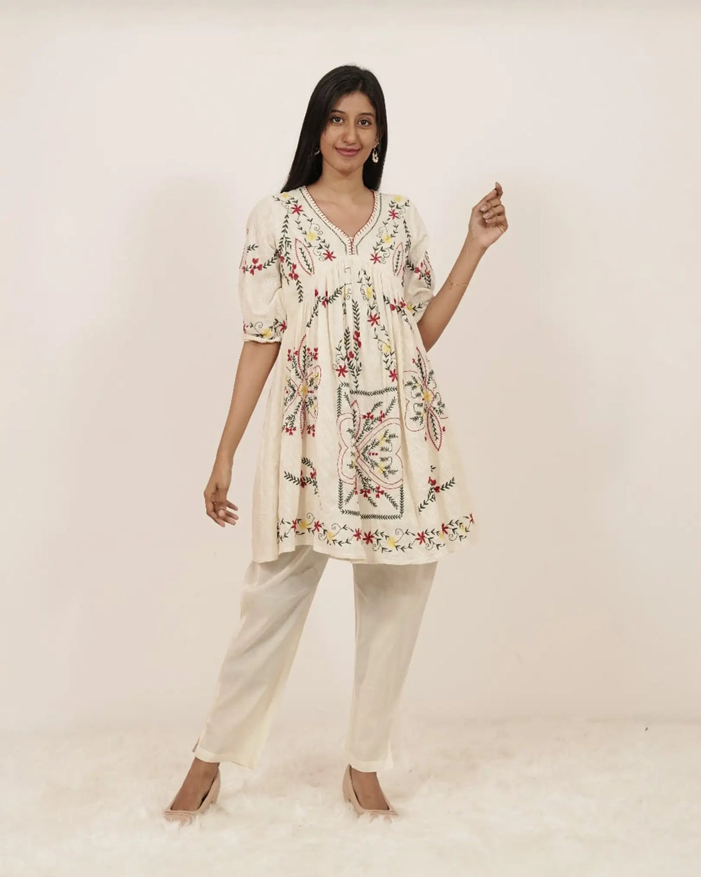 Stylish and minimal off-white cotton co-ord set designed in an Alia cut with delicate embroidery. The short top features gathered sleeve hems for a chic look, paired with a comfortable straight-fit bottom with two side pockets.
