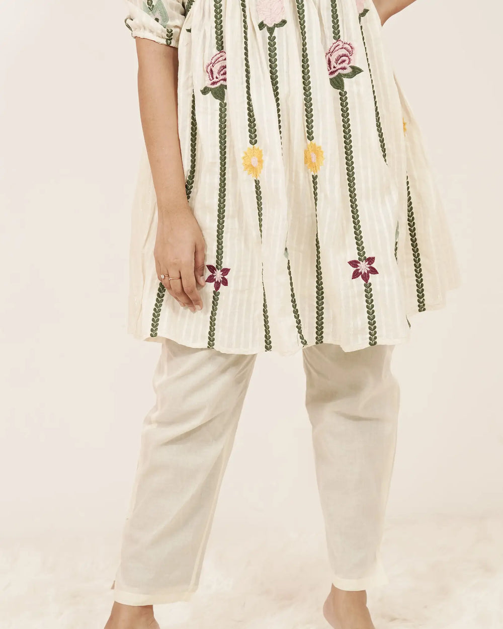 A chic off-white cotton co-ord set designed in Alia cut style with delicate floral and striped embroidery. The short top pairs effortlessly with a straight-fit bottom, featuring two side pockets for comfort and convenience.