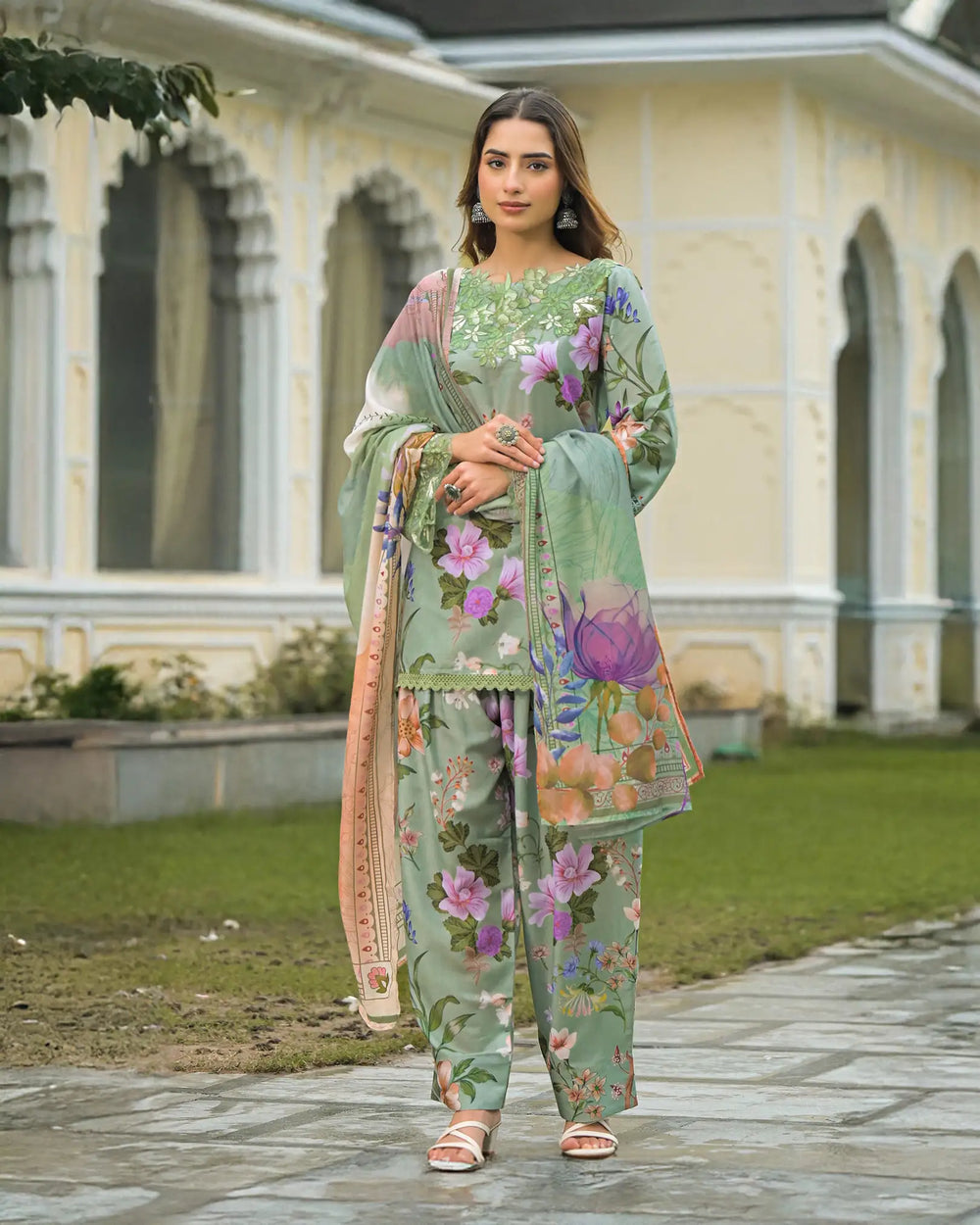 A refreshing three-piece farshi salwar set in mint green floral printed cotton. Featuring an embroidered organza-patched neck and sleeve hem, paired with a comfortable farshi bottom with side pockets and a soft printed cotton dupatta. Elegant and breathable for effortless day-to-evening wear.