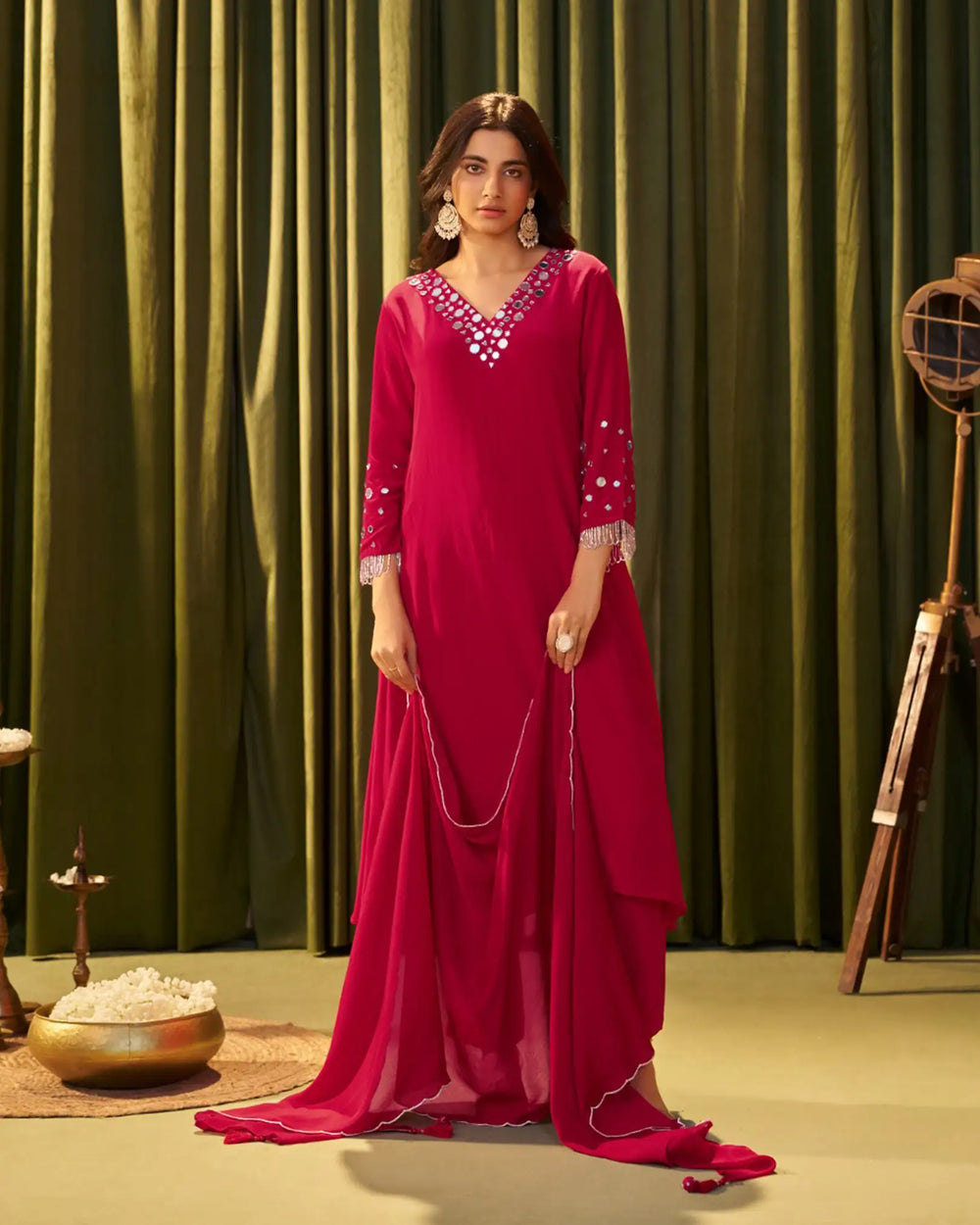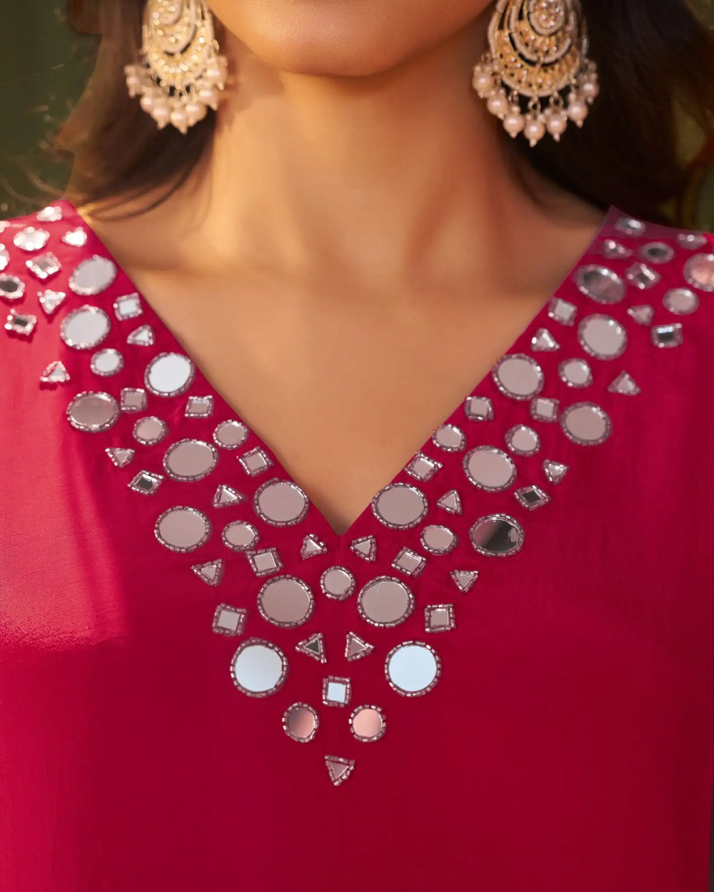 A rich and festive three-piece salwar set in deep red crepe silk. The elegant A-line salwar features mirror and bugle bead work on the neck and sleeves, with the convenience of a single side pocket. Paired with a shantoon normal-fit bottom and a soft chinon dupatta finished with scallop borders, this ensemble is perfect for weddings and celebrations.