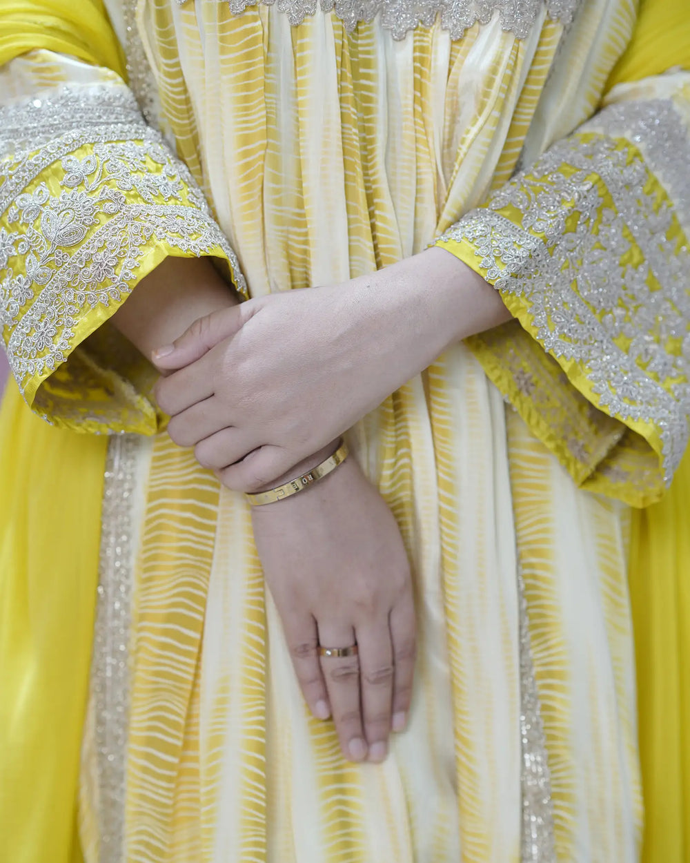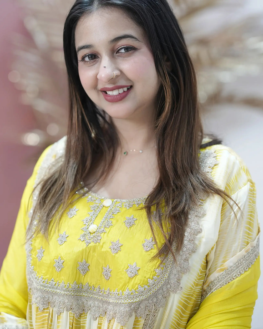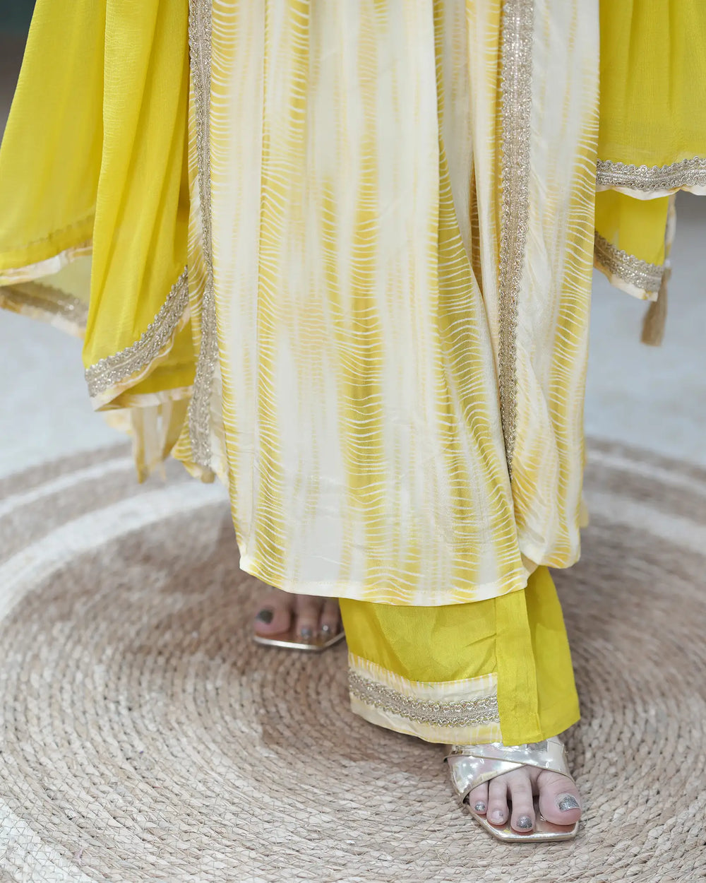 A vibrant three-piece ensemble in yellow and off-white, featuring a panel-cut crepe silk anarkali with embroidered U-shaped yoke, elegant front pleats, and delicate laced finishes. Paired with a straight-fit shantoon silk bottom and a soft chiffon dupatta, this set is perfect for festive and semi-formal occasions.