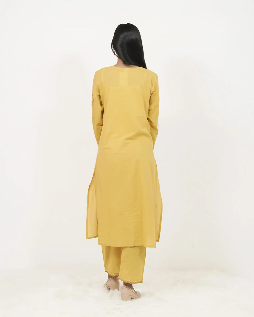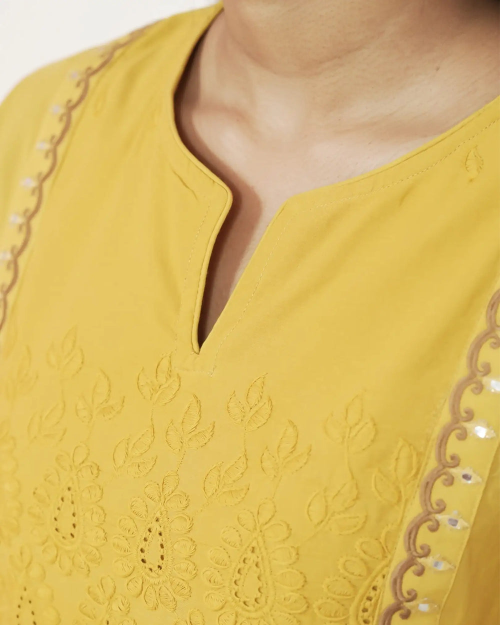 Chic mustard yellow cotton co-ord set featuring a center-gathered top with an embroidered yoke and sleeves. Paired with a straight-fit bottom finished with a laced hem and a handy one-side pocket. Styled with a round neckline and slit for easy, everyday comfort.
