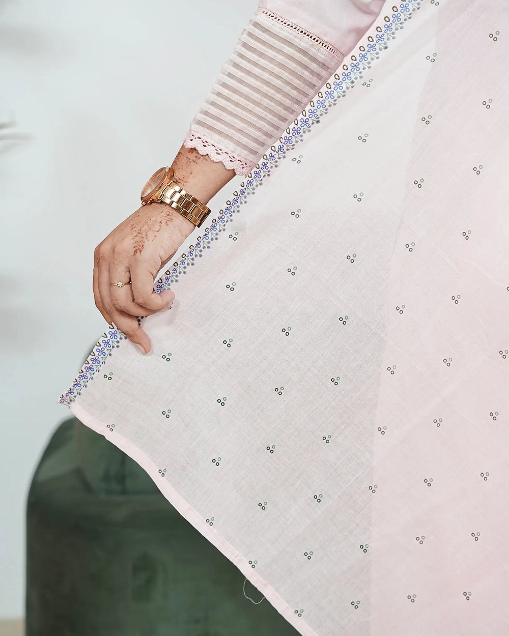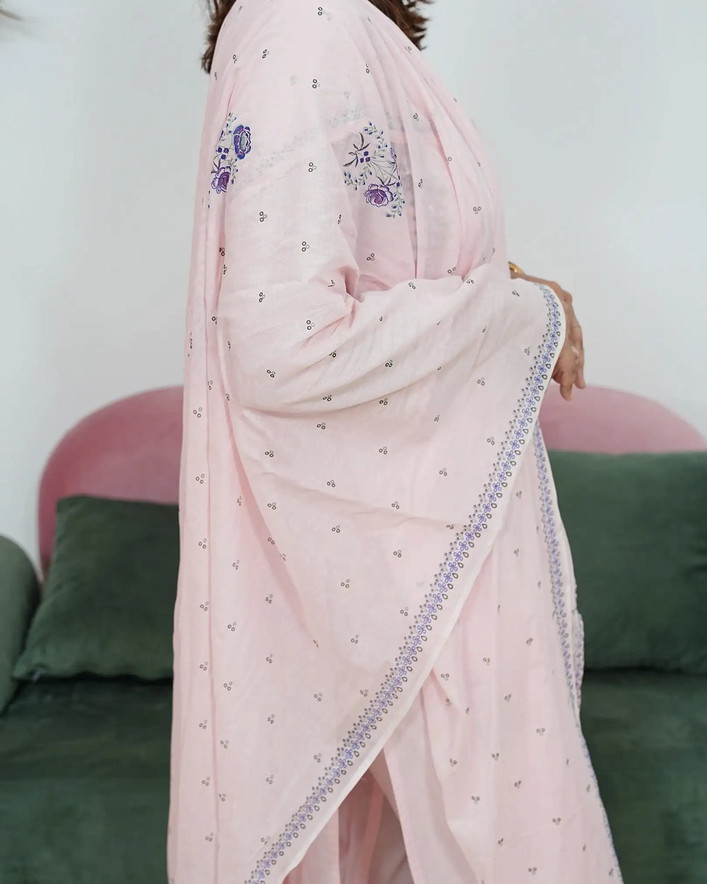 Delicate baby pink soft cotton salwar suit featuring embroidery, button accents, and knife pleats on the top. Enhanced with laced organza sleeve hems for a graceful touch, paired with a baby pink soft cotton normal-fit bottom finished with simple lace detailing. The look is completed with a soft cotton floral printed dupatta, styled with a round neckline and slit — perfect for casual and comfortable wear.