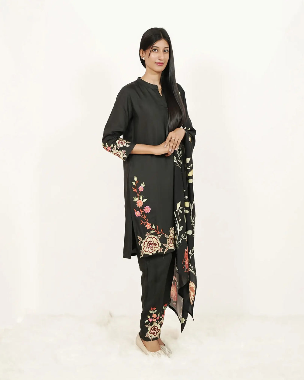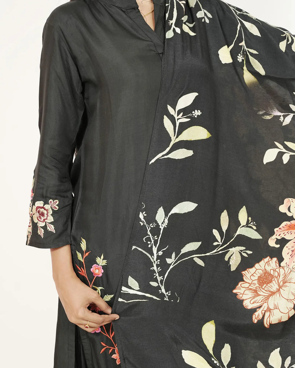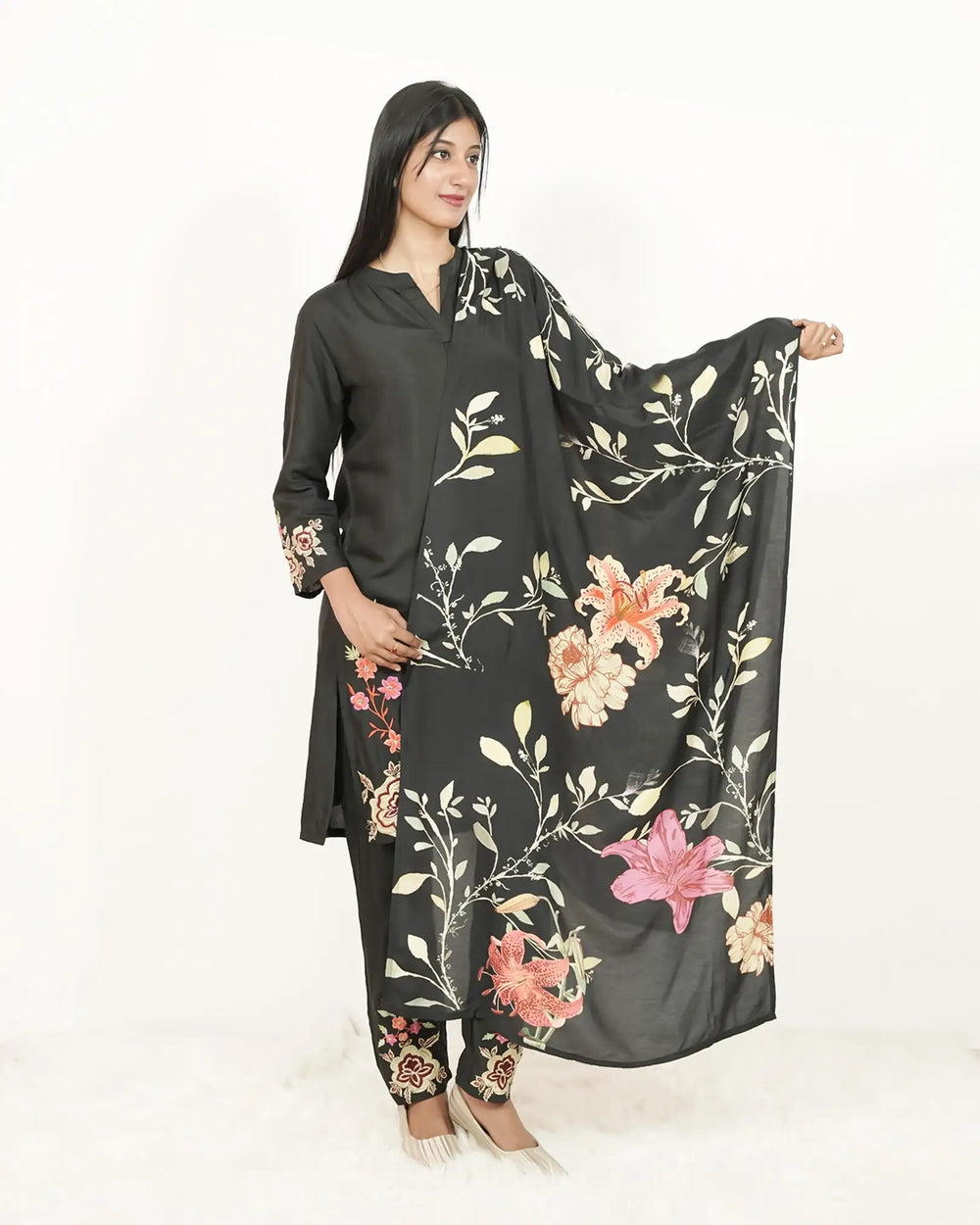 Elegant black muslin silk salwar set featuring a contrast embroidered top with a refined mandarin collar, paired with a matching embroidered muslin silk bottom. Completed with a floral printed muslin silk dupatta, this ensemble blends sophistication and traditional charm for festive occasions.