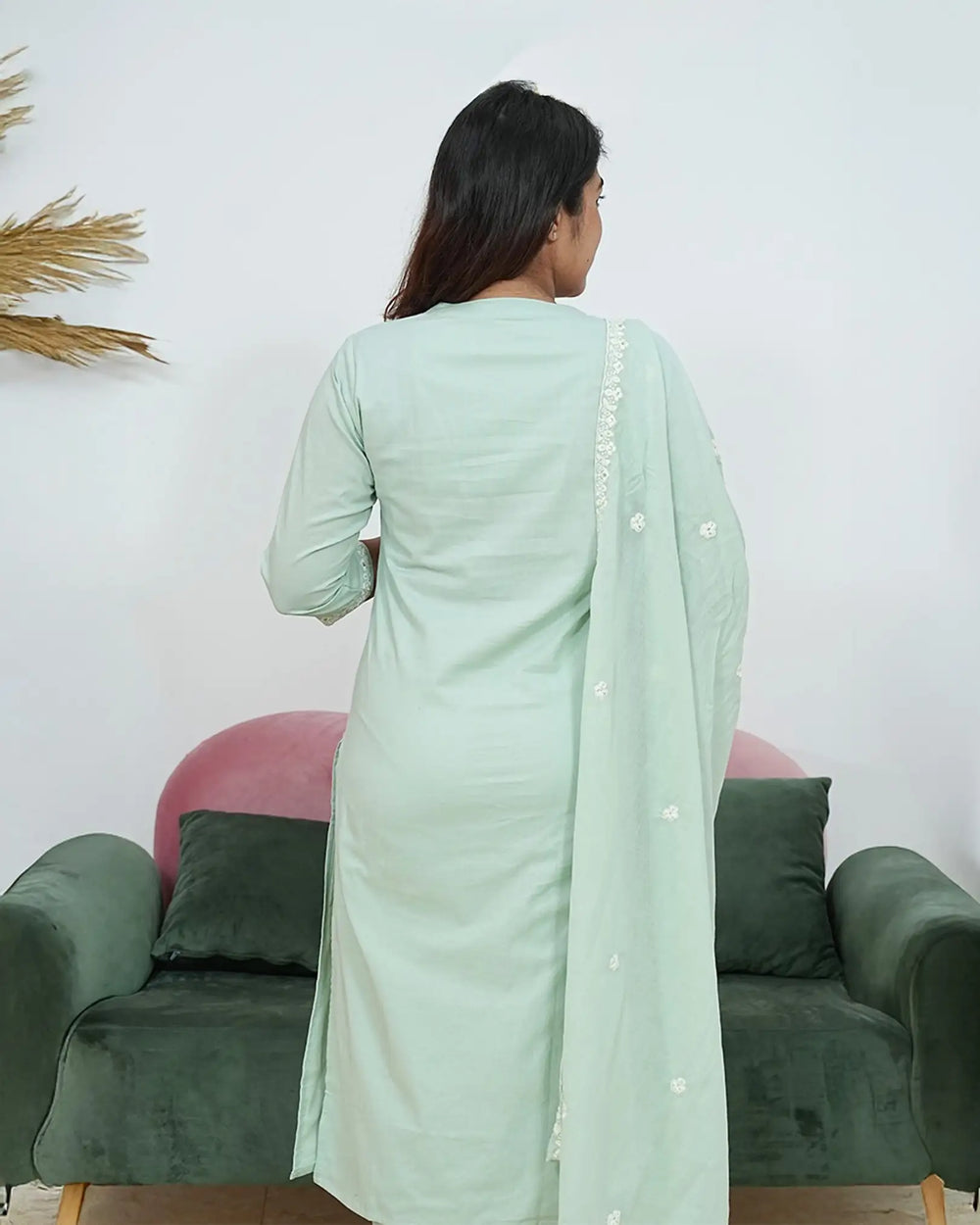 Refreshing powder green ash salwar set crafted in soft cotton, featuring an embroidered top, paired with a matching normal fit bottom detailed with embroidered hem and two side pockets. Completed with a soft cotton embroidered dupatta enhanced with thread tassels, making it a perfect blend of elegance and comfort for everyday wear or casual gatherings.