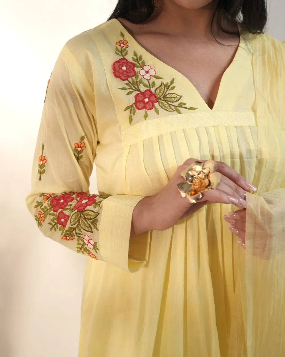 Top: pastel yellow cotton embroidered semi anarkali top with pleated yoke.