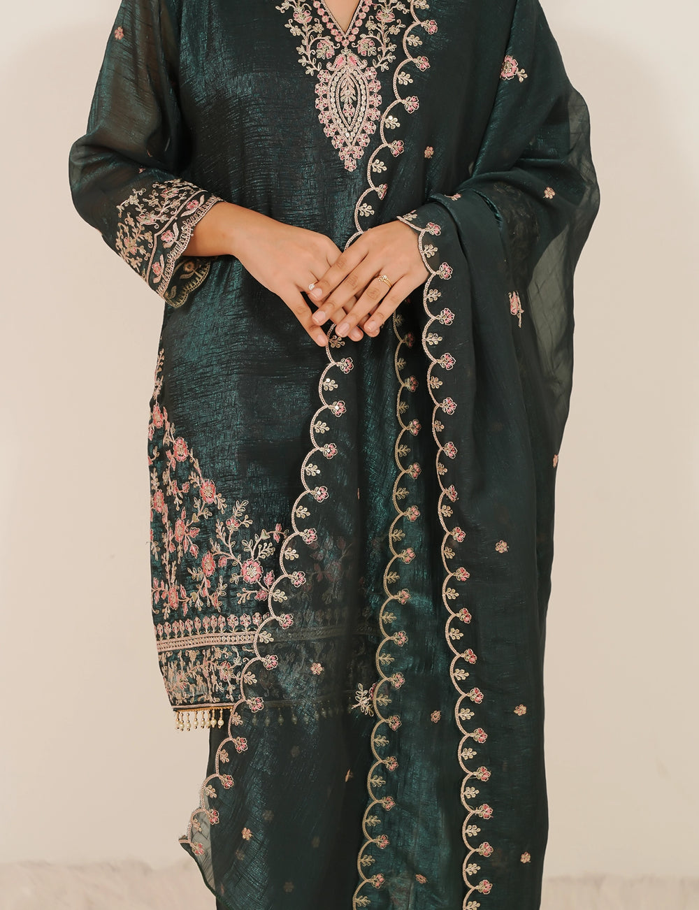 Elegant deep teal green gajji silk salwar suit designed with a short embroidered top accented with tassels. Paired with a matching embroidered gajji silk normal-fit bottom and a luxurious gajji silk dupatta beautifully finished with embroidery and scallop borders. Styled with a round neck and long slit, completed with plain, top stitch, and overlock craftsmanship for a rich semi-party look.