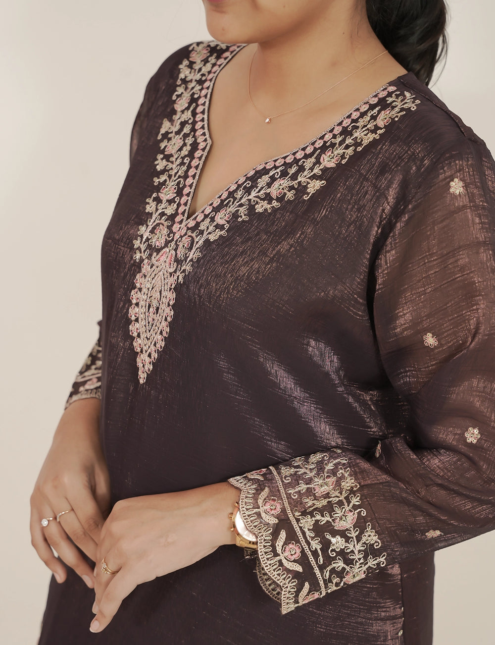 Elegant purple brown gajji silk salwar suit designed with a short embroidered top accented with tassels. Paired with a matching embroidered gajji silk normal-fit bottom and a luxurious gajji silk dupatta beautifully finished with embroidery and scallop borders. Styled with a round neck and long slit, completed with plain, top stitch, and overlock craftsmanship for a rich semi-party look.