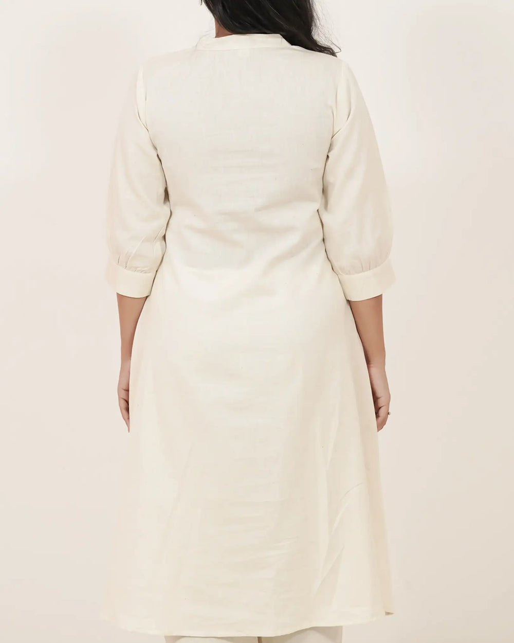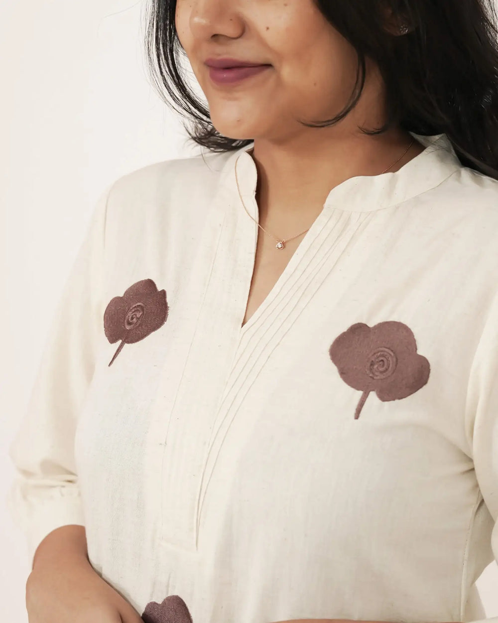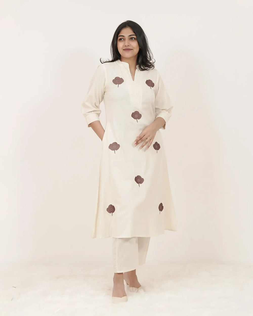 Elegant off-white cotton set featuring a brown embroidered A-line top with functional pockets, gathered sleeve hems, and a chic mandarin collar. Paired with a straight fit off-white cotton bottom, this ensemble combines comfort, utility, and subtle ethnic elegance.