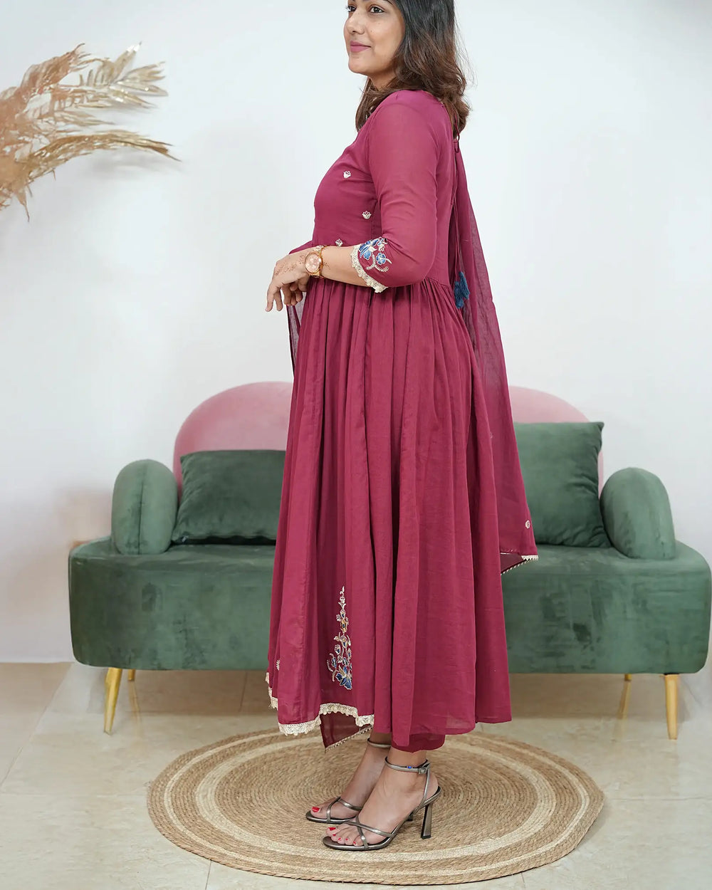 This elegant deep maroon ensemble is crafted in soft cotton with timeless embroidery and lace accents. The Anarkali top features a gathered waist and wide back neckline for a graceful silhouette. Paired with a comfortable normal-fit bottom and a beautifully embroidered dupatta, it’s perfect for festive and traditional occasions.
