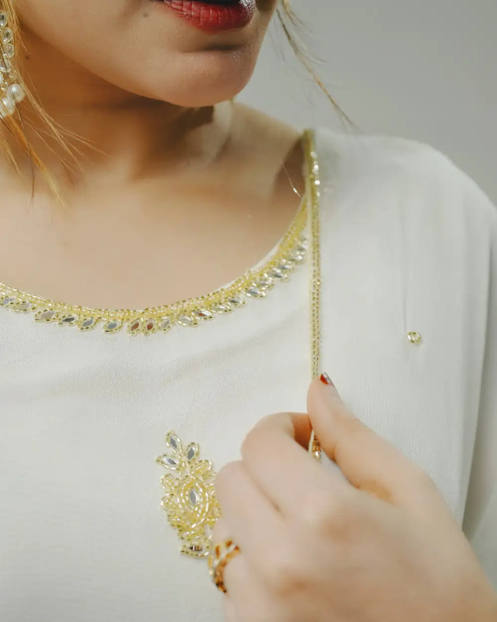 Top: white color georgette salwar top adorned with intricate handwork. Bottom: white color shantoon silk normal fit bottom for a comfortable look. Dupatta: white color georgette dupatta enhanced with minimal handwork detailing.