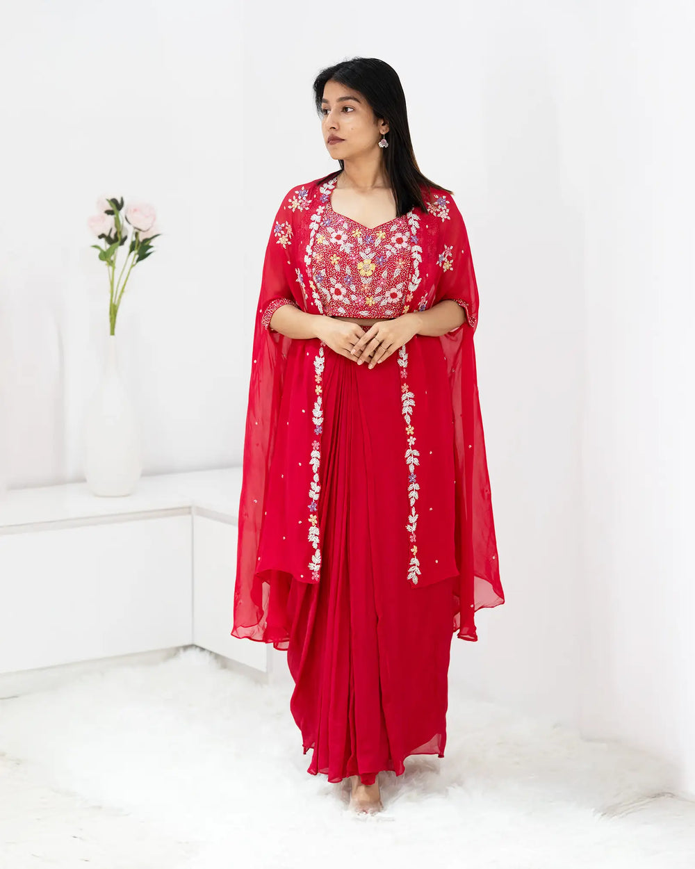 In the Box: 1 × Cherry Red Dola Silk Handworked Crop Top, 1 × Pure Chinon Draped Skirt with Handworked Waistband, 1 × Organza Kaftan Overcoat (handworked borders & sleeve openings)