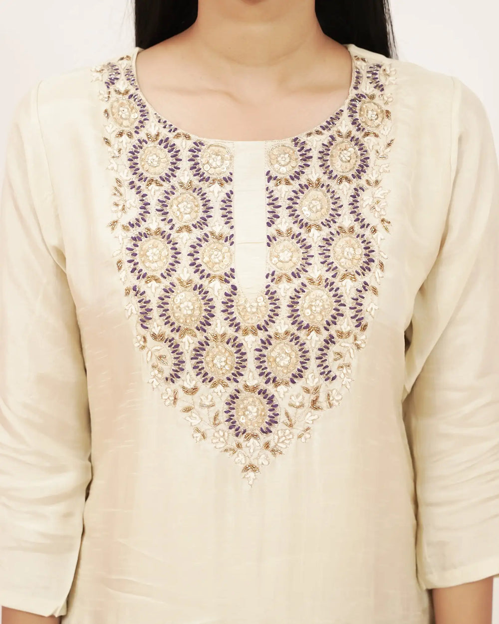 Ivory Dola Silk salwar suit with embroidered neckline, paired with a straight-fit shantoon bottom and an organza dupatta enhanced with sequins and scallop borders.