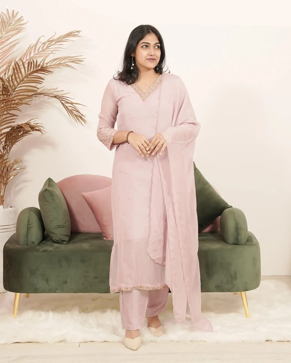 Lemonade Pink organza salwar suit with delicate handwork on neckline, hem, and sleeves. Paired with a straight-fit shantoon bottom and an organza dupatta featuring scallop borders and light embroidery.