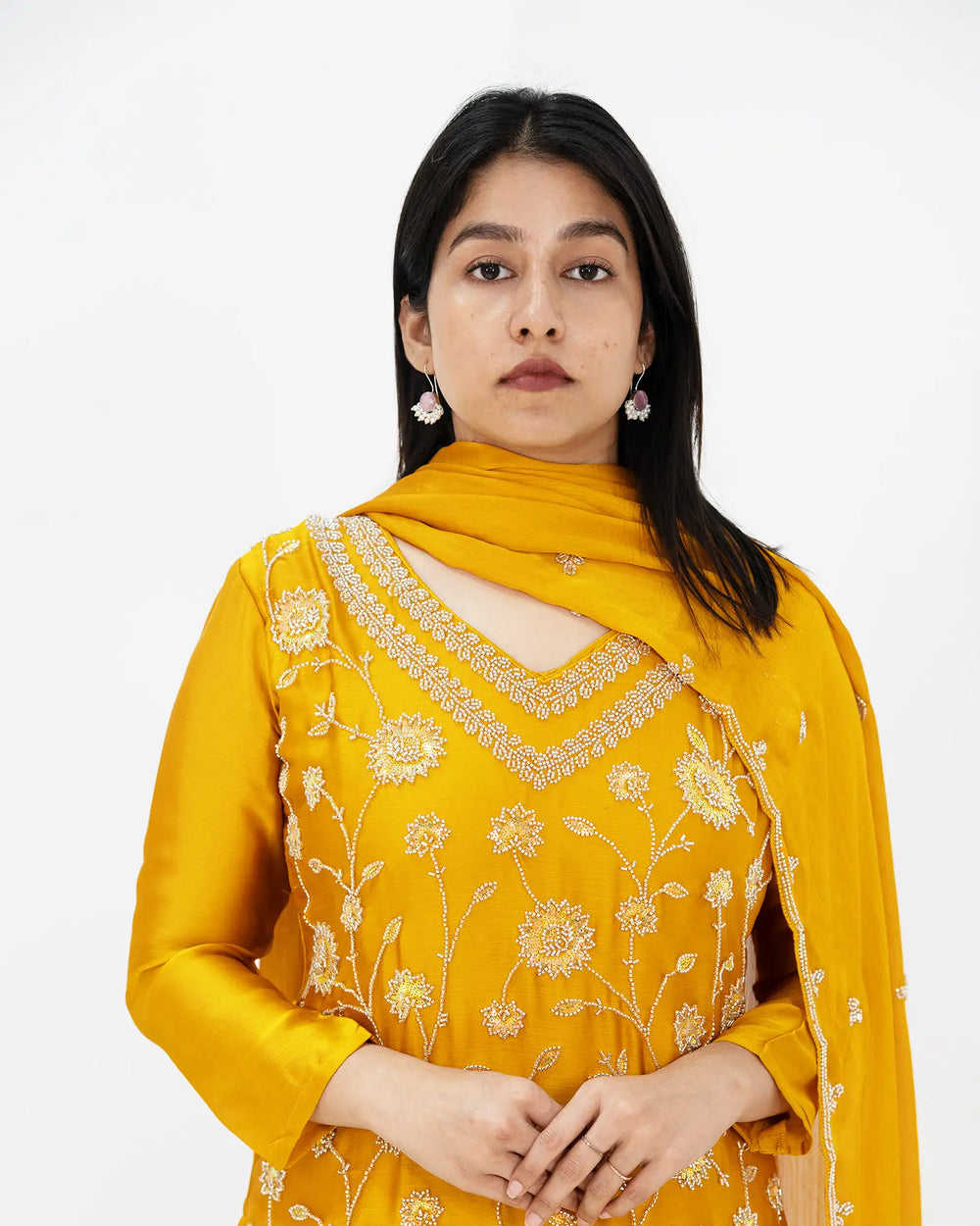 Radiant Golden Yellow Pure Chinon ensemble featuring a heavy handworked V-neck top, mid-gathered sharara bottoms, and a graceful handworked dupatta with scallop borders.