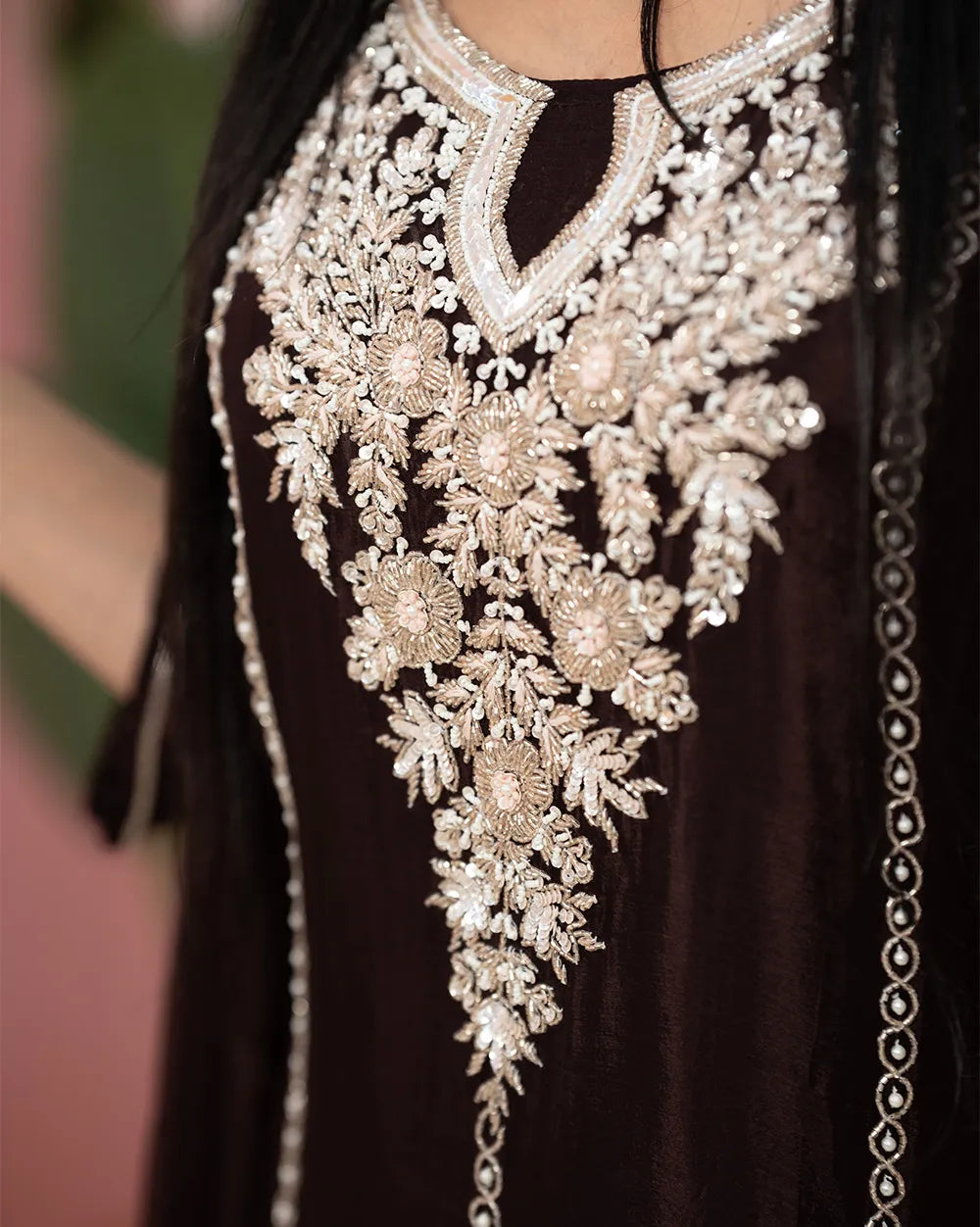 Top: Dark brown chinon silk top adorned with rich and heavy handwork.