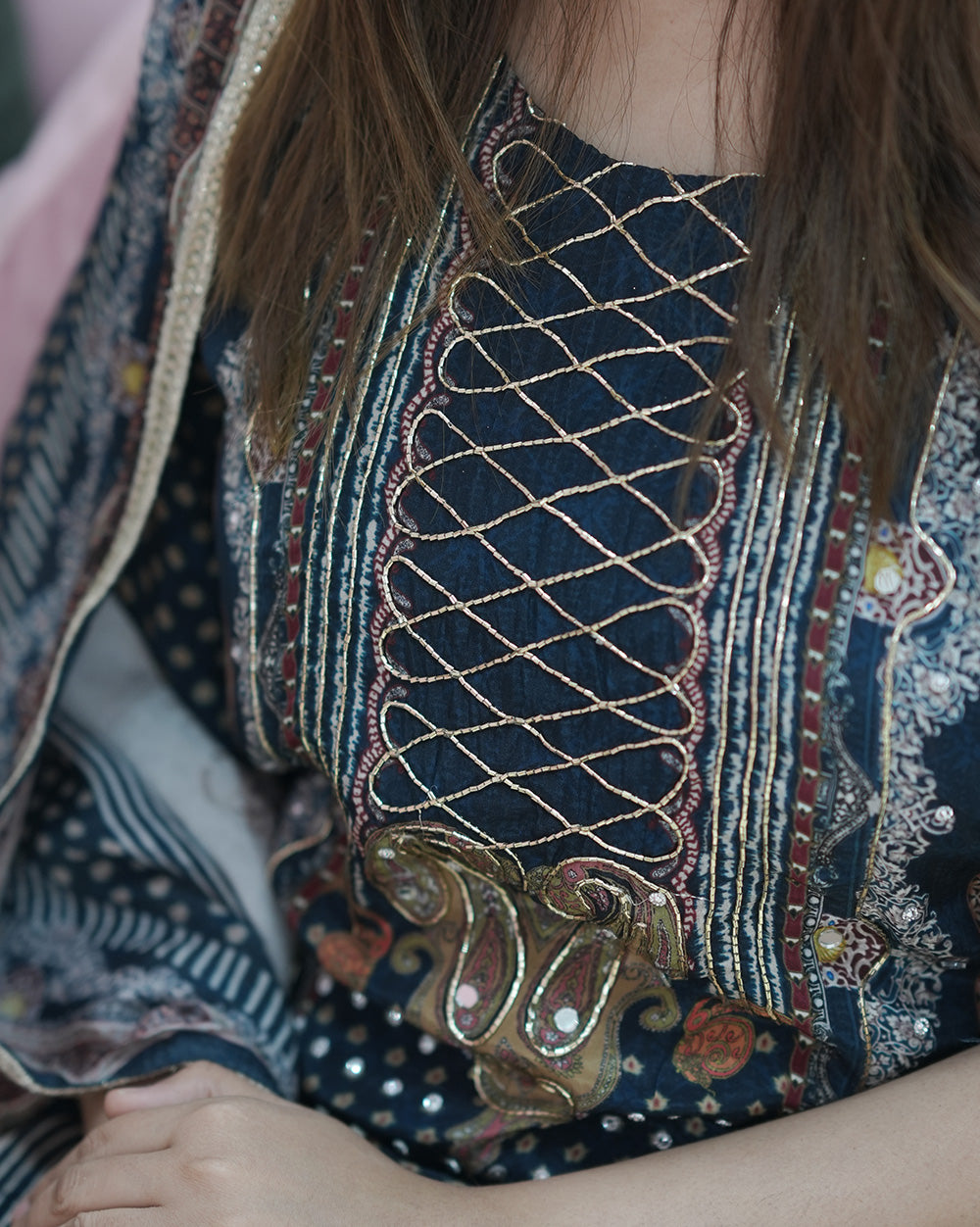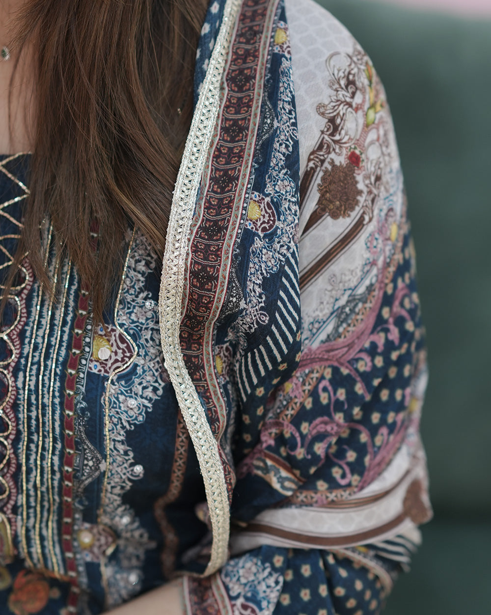 In the Box: Midnight Blue Crepe Silk Handworked Salwar Top, Midnight Blue Shantoon Straight Fit Bottom, and Chinon Silk Blue & Gray Multi-Printed Dupatta with Lace Detailing.