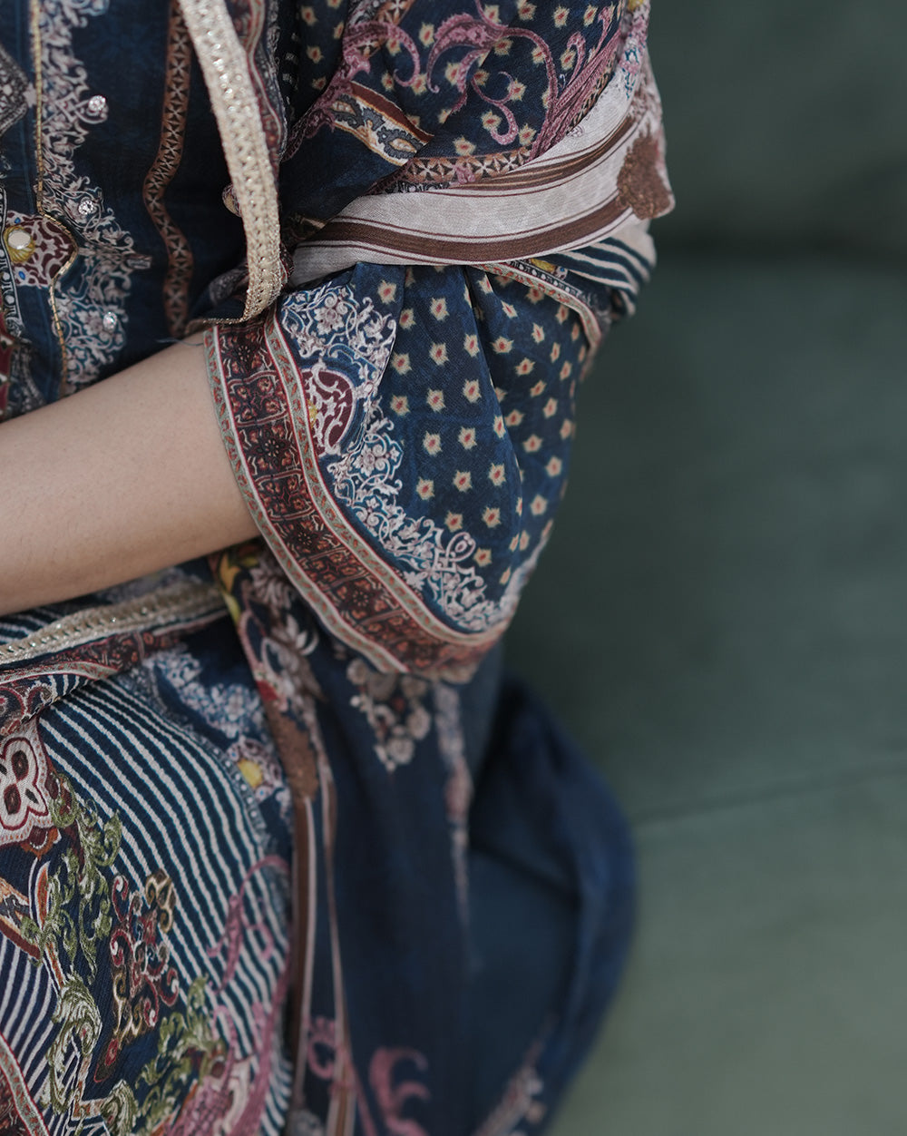 Top: midnight blue printed crepe silk salwar top with handworks. Bottom: midnight blue shantoon straight fit bottom. Dupatta: chinon silk blue and gray multi printed dupatta with simple lace detailing.