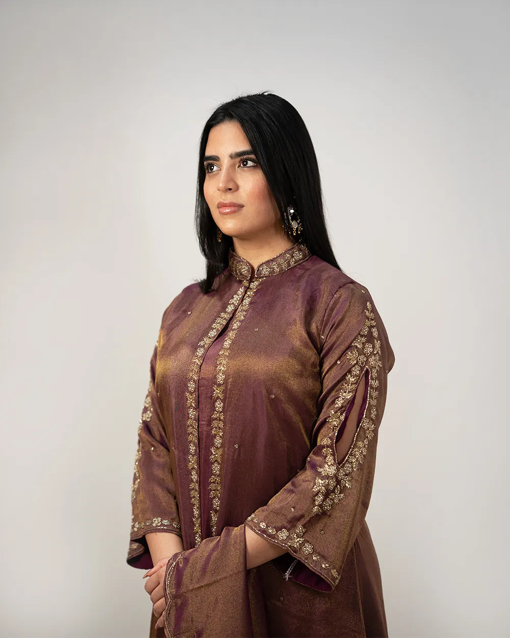 Top: Purple shade tissue silk A-line top with mandarin collar, in-built front overcoat, eye-shaped sleeve openings, and elegant handwork.
