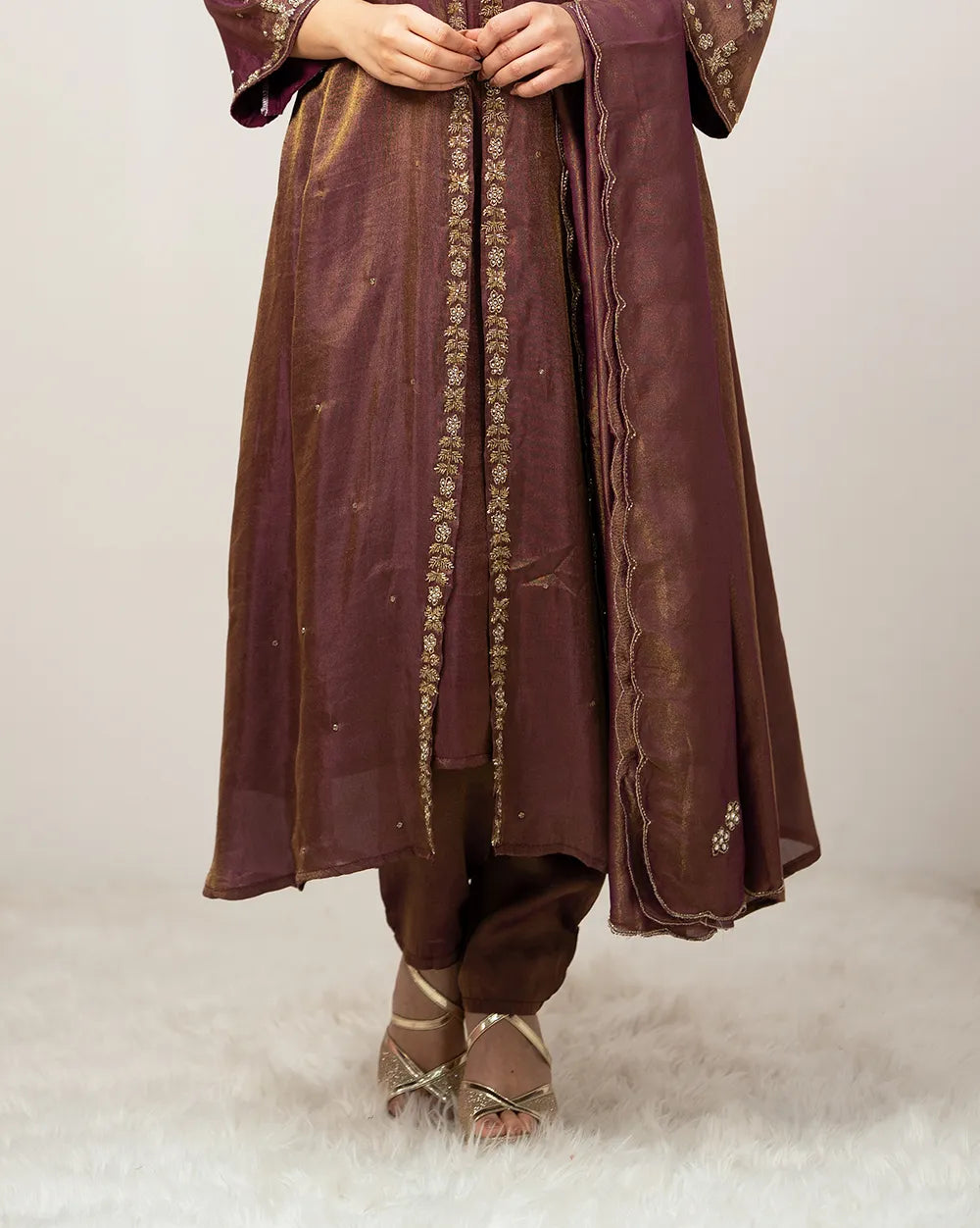 In the Box: Purple shade tissue silk A-line handworked top with in-built front overcoat, purple tissue silk straight-fit bottom with crepe lining, and purple tissue silk dupatta with minimal handwork and scallop borders.