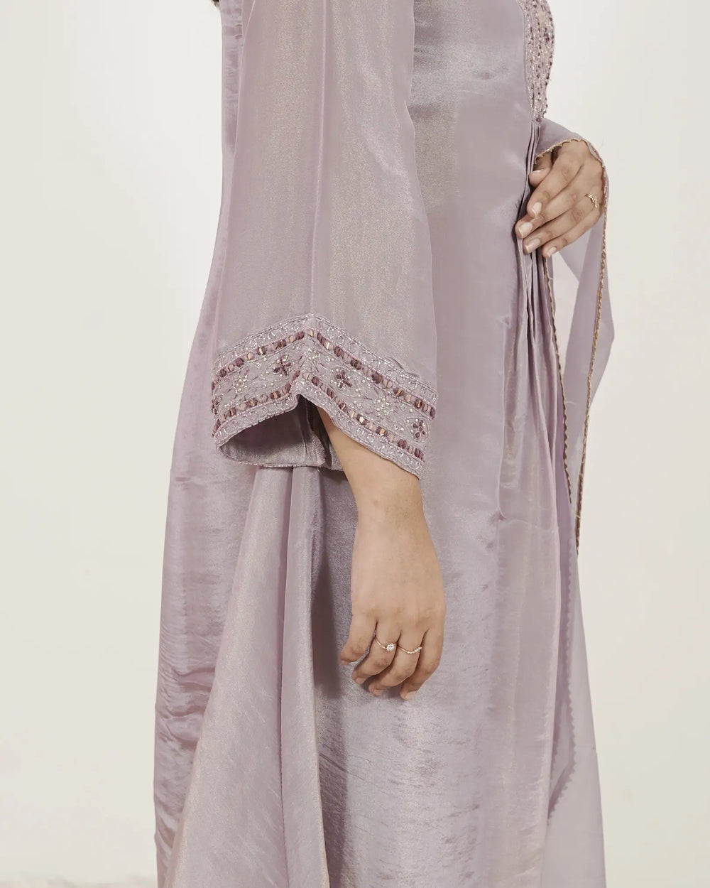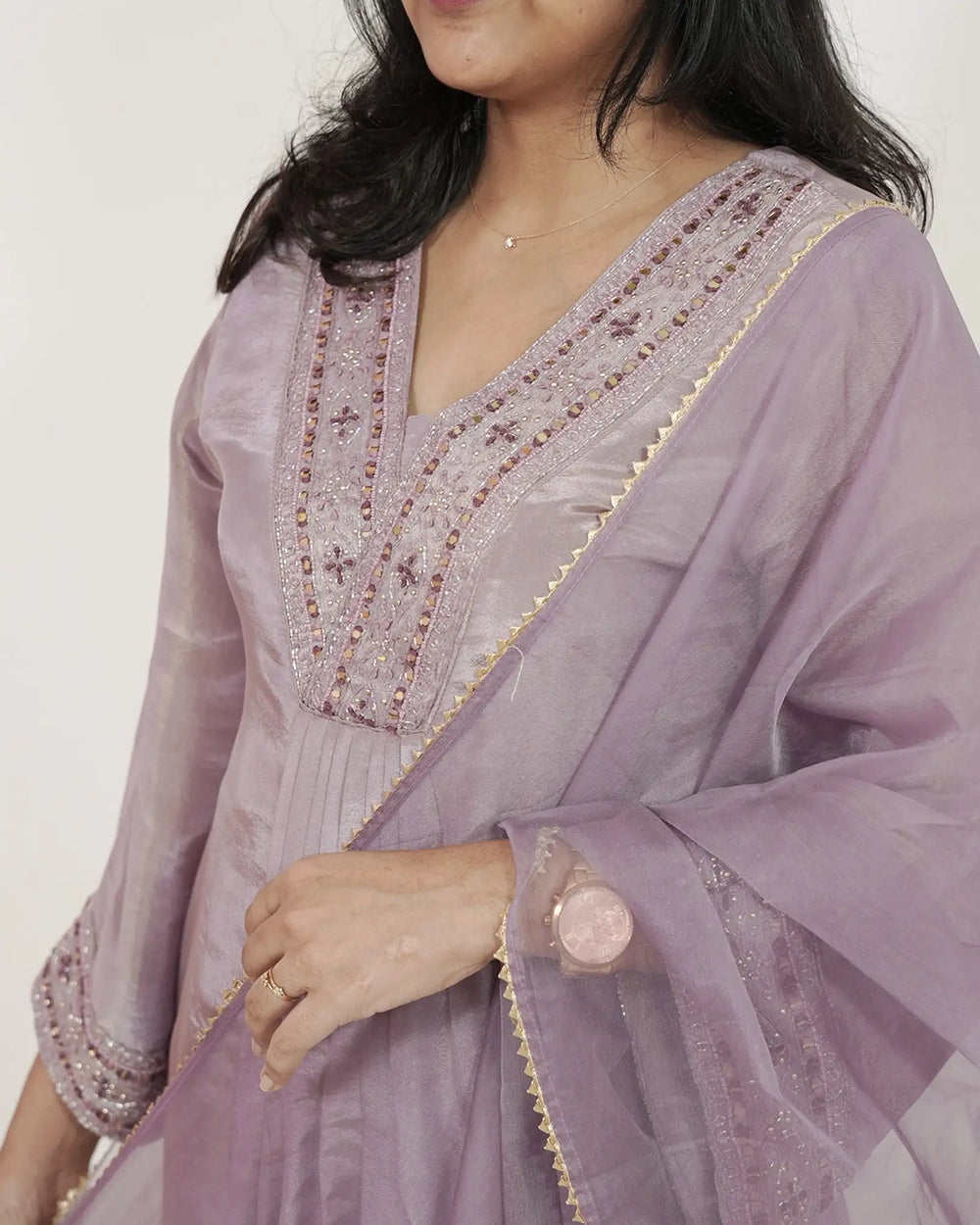In the Box: 1 × Lilac Tissue Silk Handworked A-line Anarkali, 1 × Shantoon Silk Straight-Cut Bottom with Organza Hem, 1 × Lilac Organza Dupatta (lace borders & tassels)