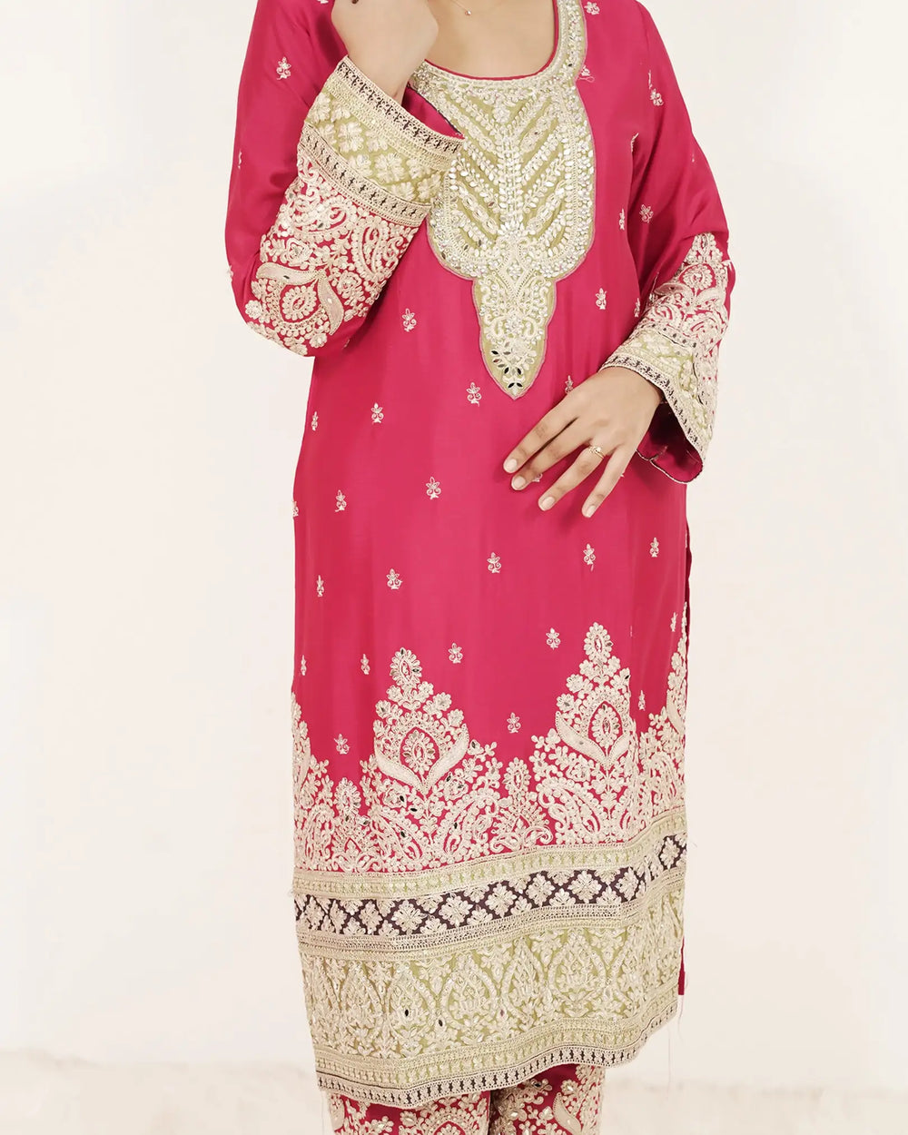 Striking Rani Pink Chinon Silk salwar suit featuring intricate embroidery with mirror work and bead embellishments, paired with a matching straight-fit bottom adorned with embroidered mirror hem, and a contrasting Olive Green Chinon Silk dupatta highlighted with embroidered motifs and borders.