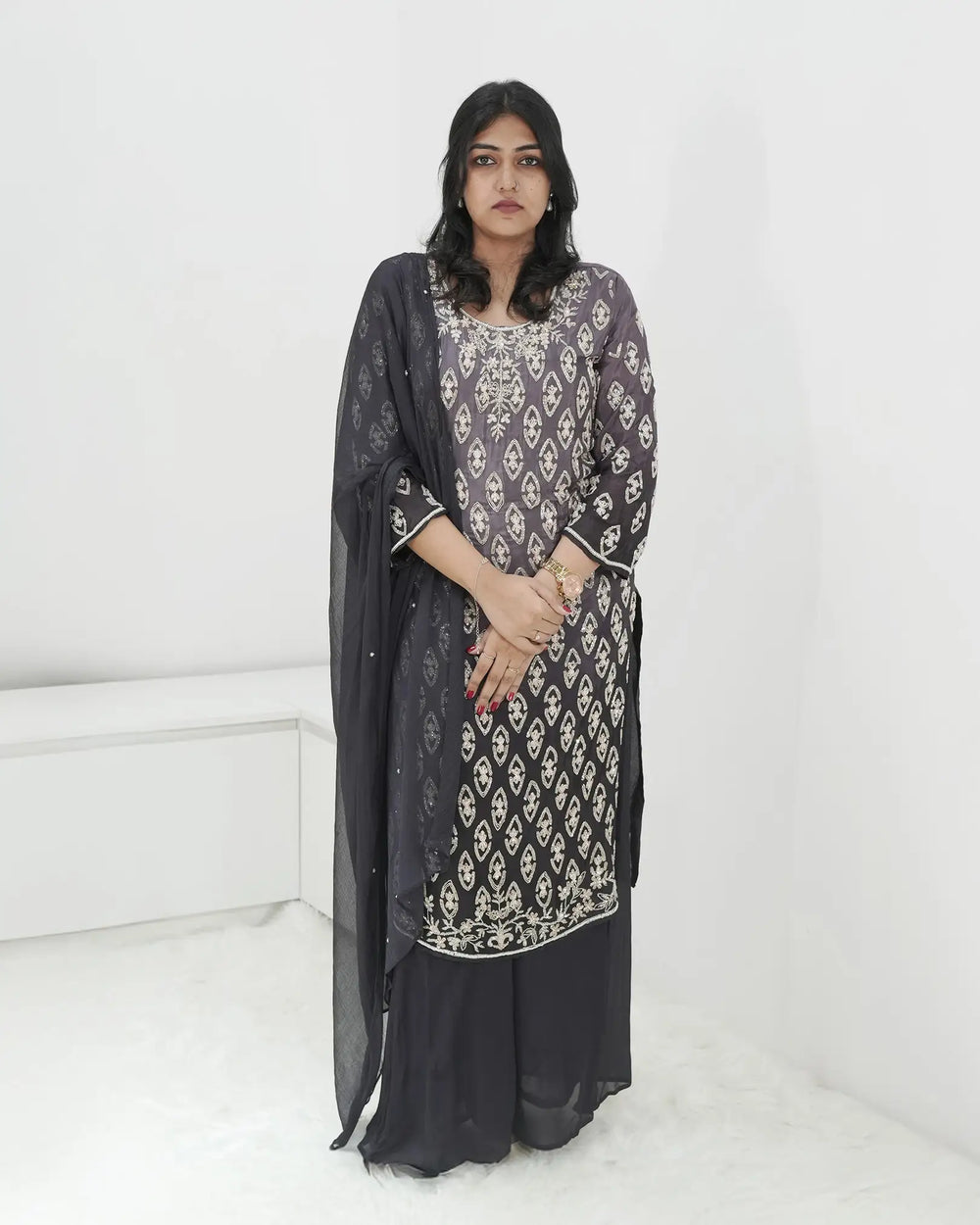 In the Box: 1 × Purplish Grey Ombre Chinon Silk Handworked Suit, 1 × Premium Chinon Silk Plazo, 1 × Chiffon Dupatta (handworked)