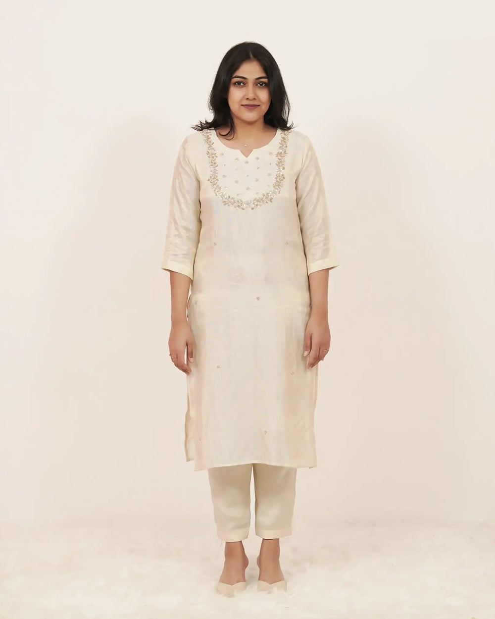 Elegant off-white tissue silk salwar suit featuring minimal floral handwork on the top and a round neckline with a stylish slit. Paired with an off-white shantoon bottom in a normal fit and a matching off-white crush tissue dupatta adorned with borders. Finished with plain, top stitch, and overlock detailing for a refined festive look.