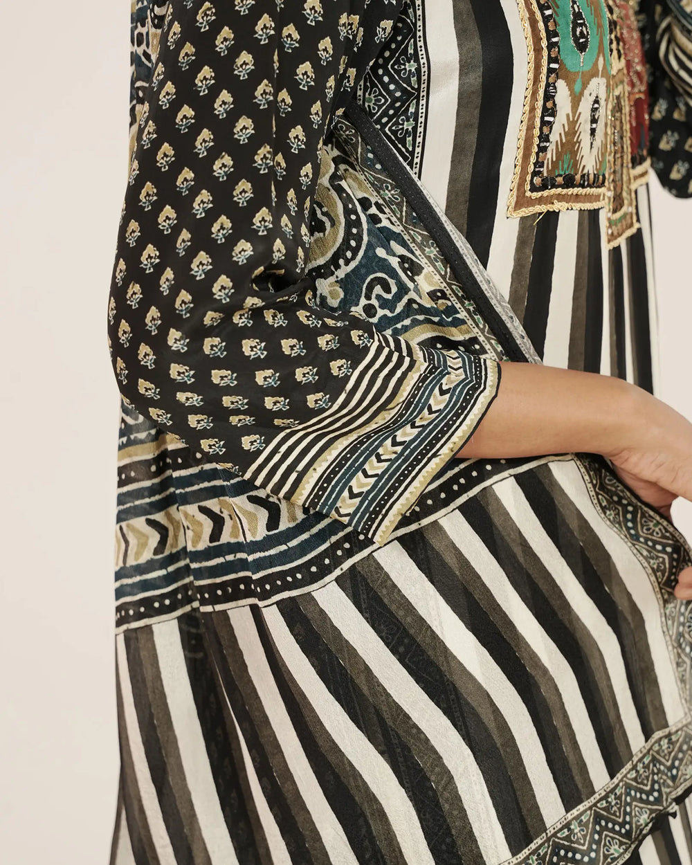 Stylish semi-party wear suit featuring a black, grey, and white crepe silk salwar top with floral and geometric multi-prints enhanced by mirror work. Paired with a black shantoon normal-fit bottom and a grey chinon silk dupatta detailed with multi-prints for a chic contrast. Styled with a classic round neckline and finished with plain, top stitch, and overlock craftsmanship.