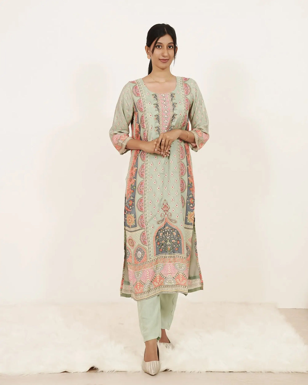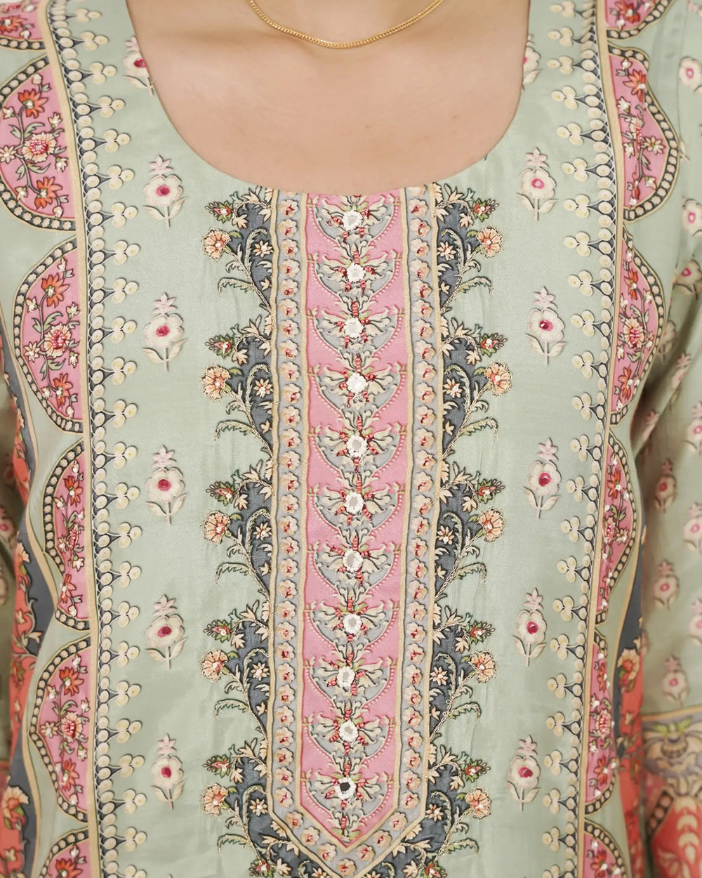 Refreshing pastel blue-green salwar suit crafted in muslin silk, featuring elegant multi-prints and subtle beadwork detailing. Paired with a pastel sage green soft silk normal-fit bottom and a vibrant multi-colored muslin silk dupatta adorned with multi-prints. Styled with a round neckline and finished with plain, top stitch, and overlock craftsmanship for semi-party elegance.
