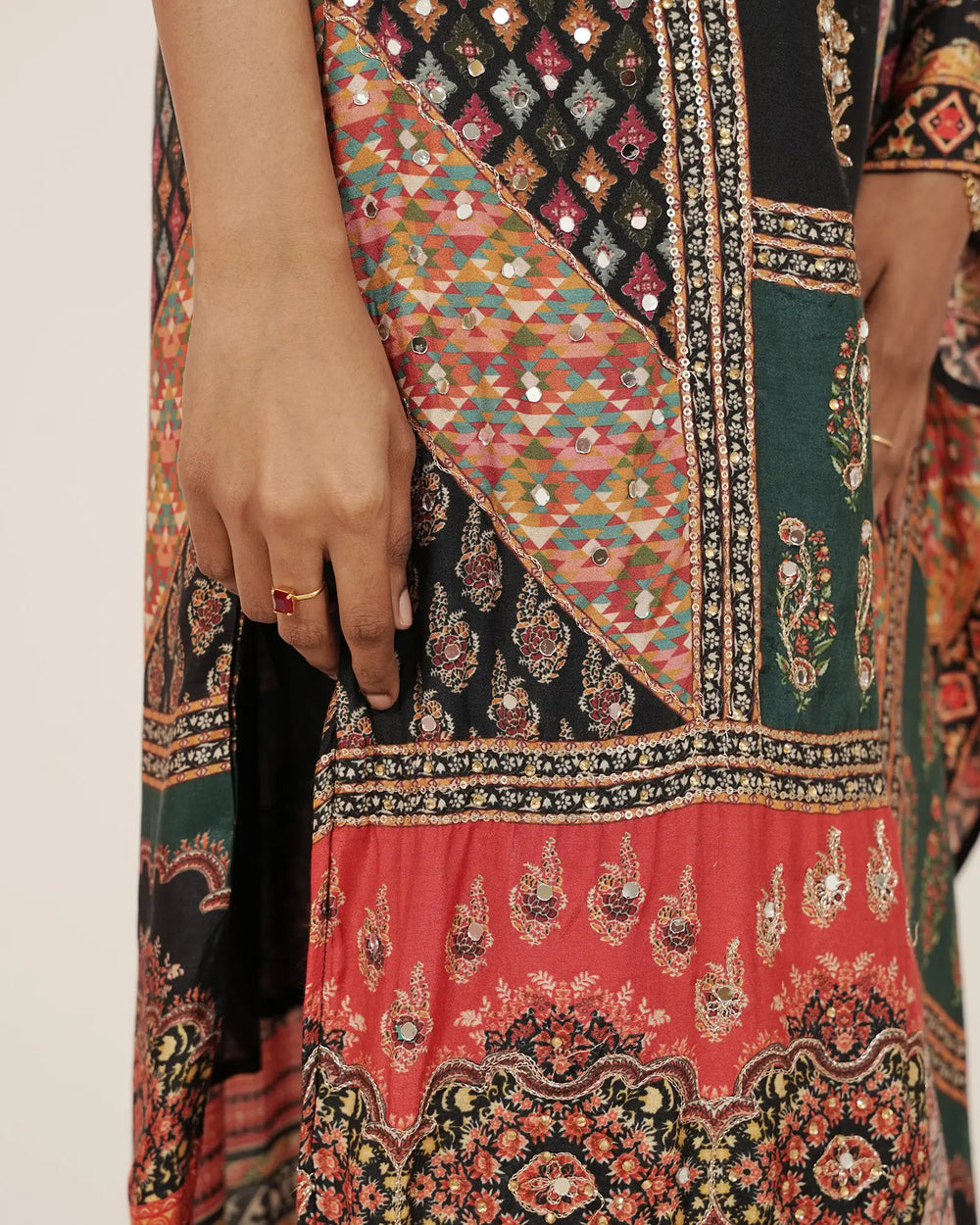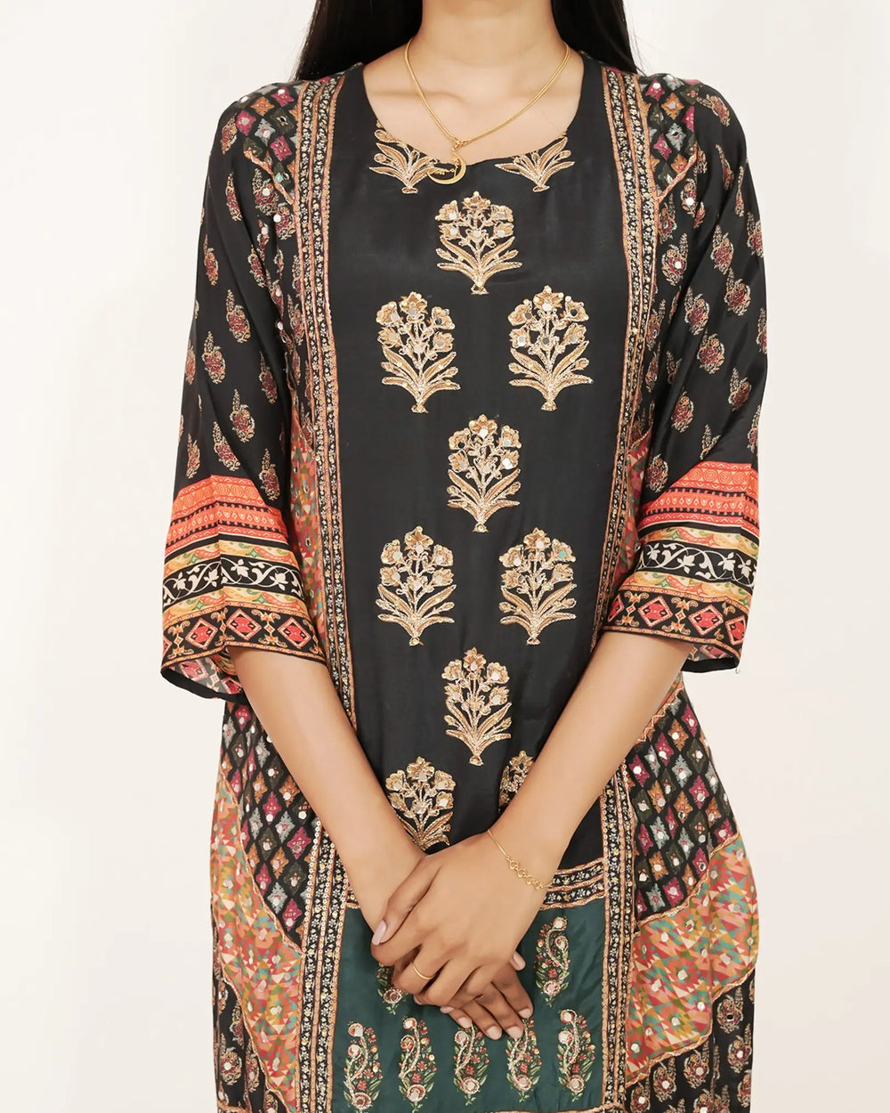 Elegant black muslin silk salwar suit featuring multi-print patterns with mirror work and delicate embroidery on the top. Paired with a black shantoon normal-fit bottom and a muslin silk multi-printed dupatta that complements the look. Designed with a stylish boat neckline and finished with plain, top stitch, and overlock detailing for a refined party look.