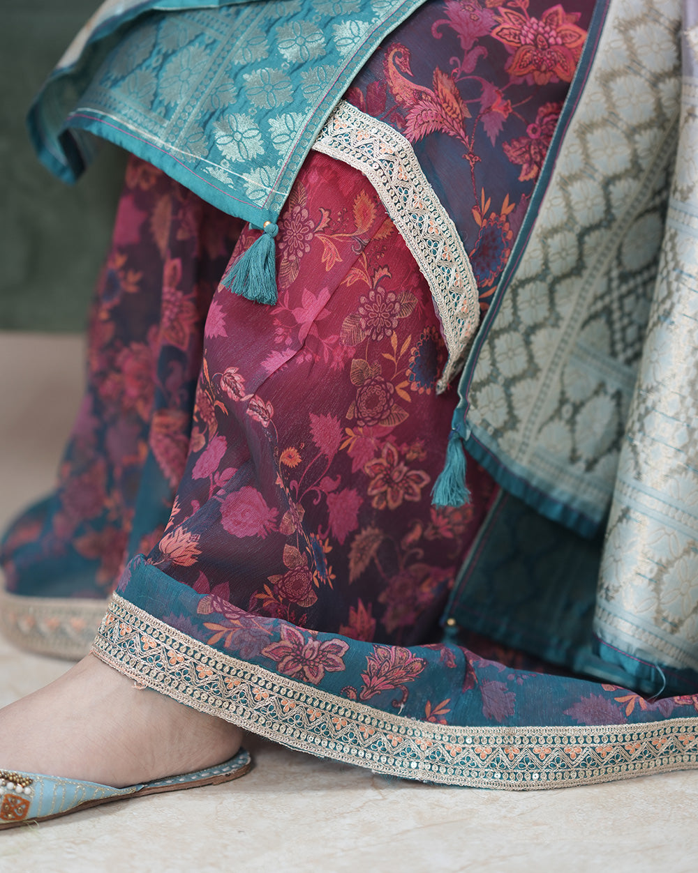 Top: red and green ombre shaded printed soft organza salwar top with embroidery. Bottom: red and green printed soft organza sharara bottom with lace detailing. Dupatta: red and green printed soft brocade dupatta.
