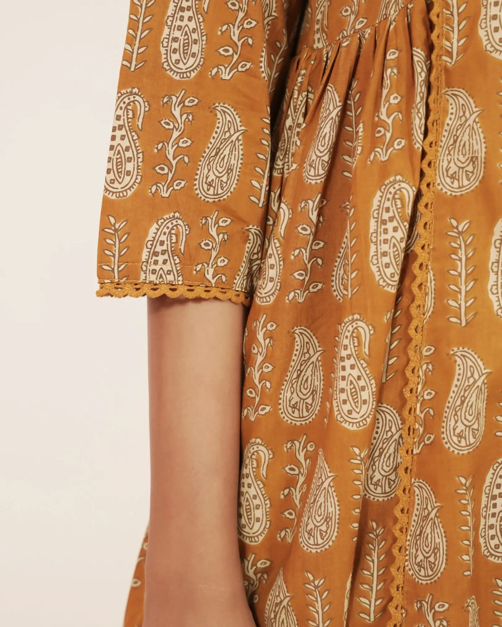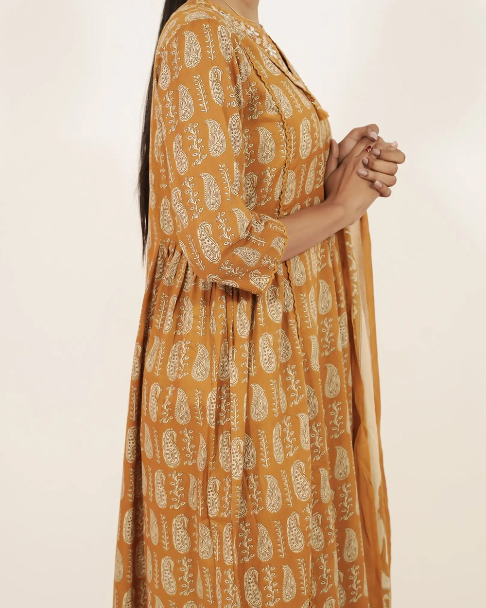 A vibrant mustard yellow cotton anarkali set featuring paisley prints, delicate mirror work, and lace accents. Paired with a straight-fit bottom and a soft cotton printed dupatta, this ensemble is perfect for casual festive occasions and ethnic gatherings.