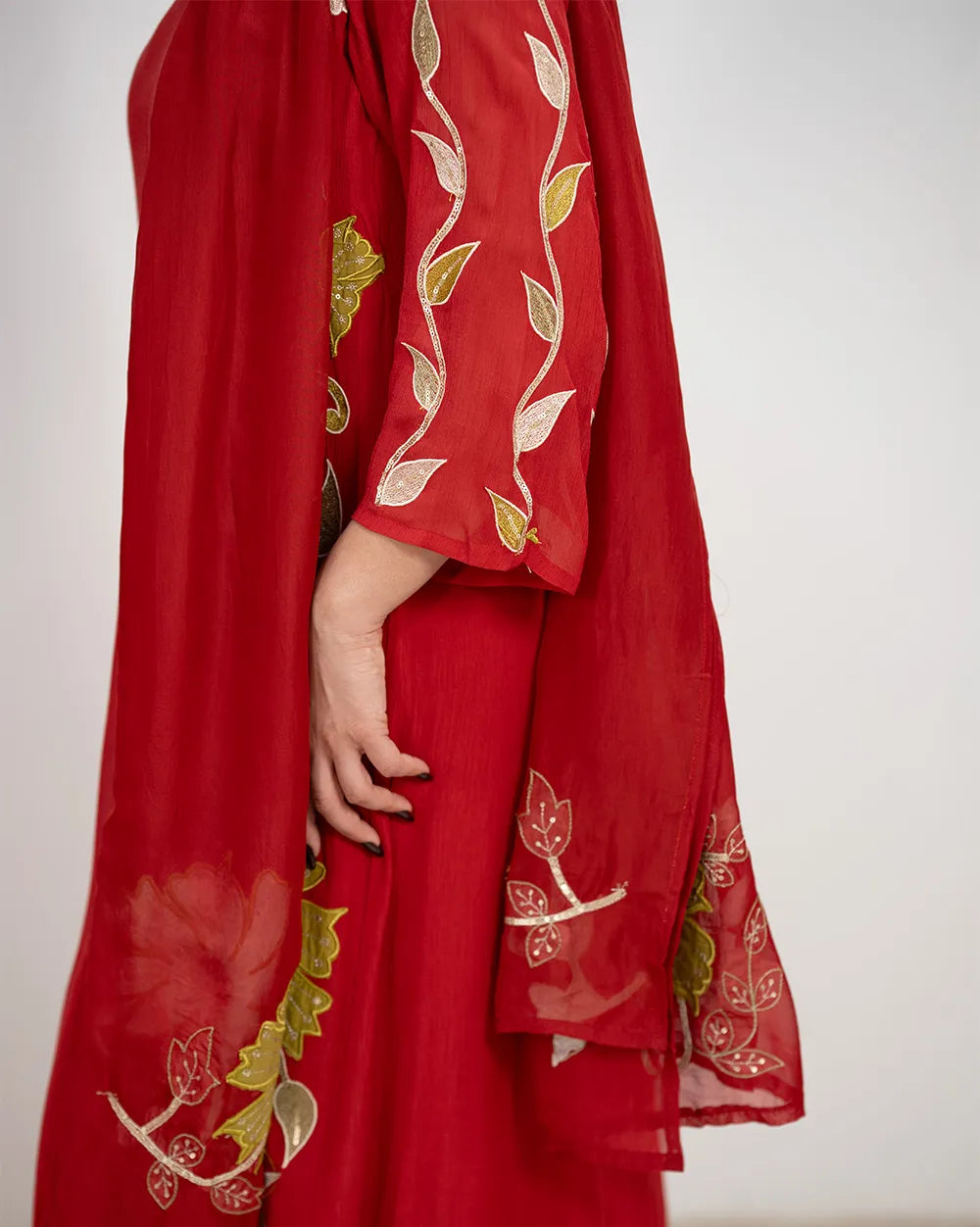 Dupatta: Brick red organza dupatta featuring beautiful applique work.