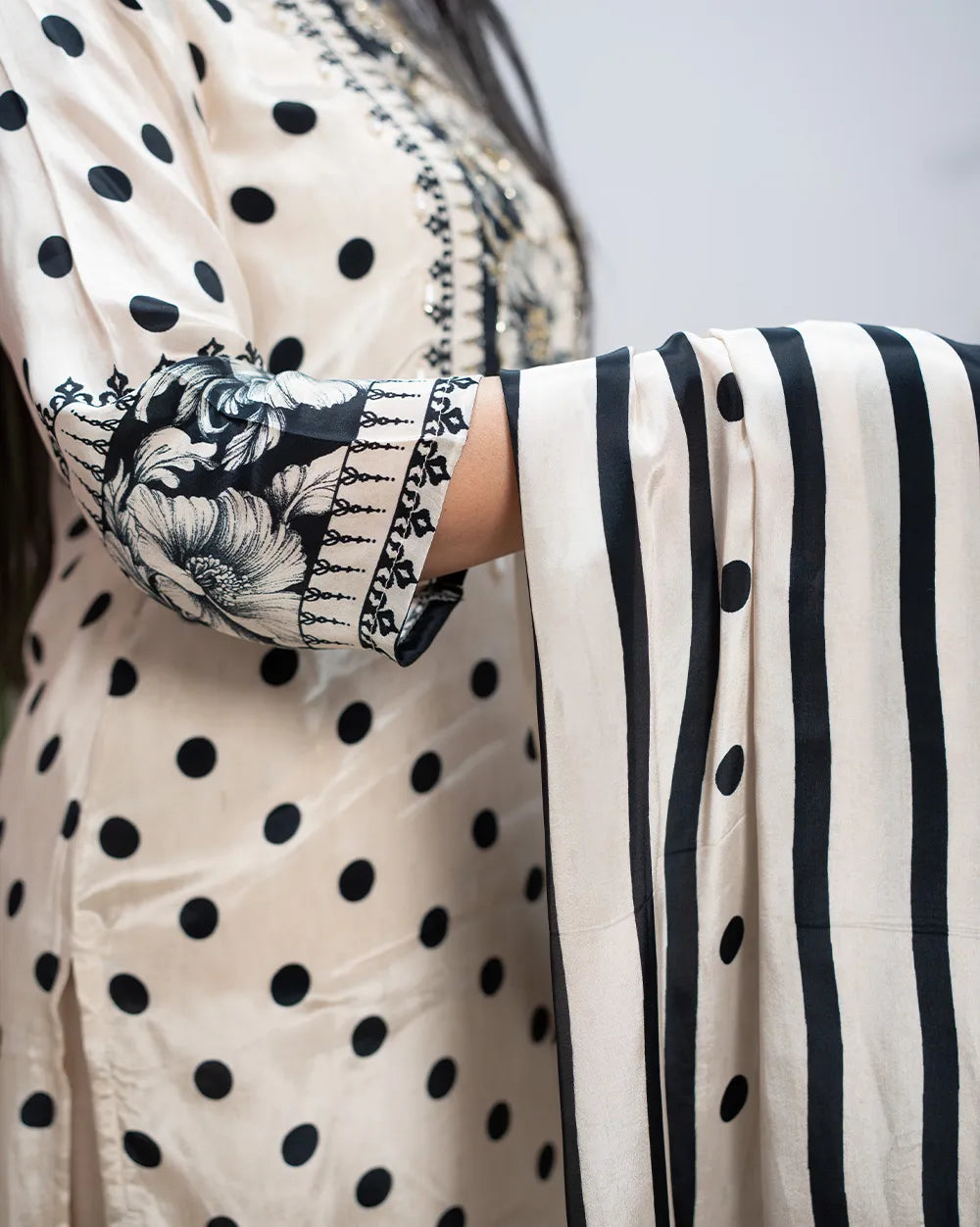 Dupatta: Black and beige crepe silk dupatta with elegant polka dot and stripe prints.