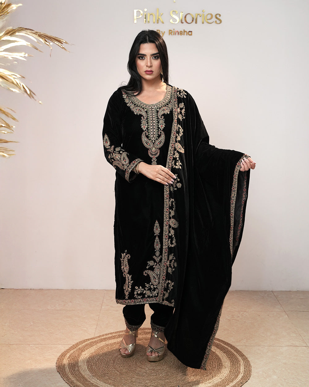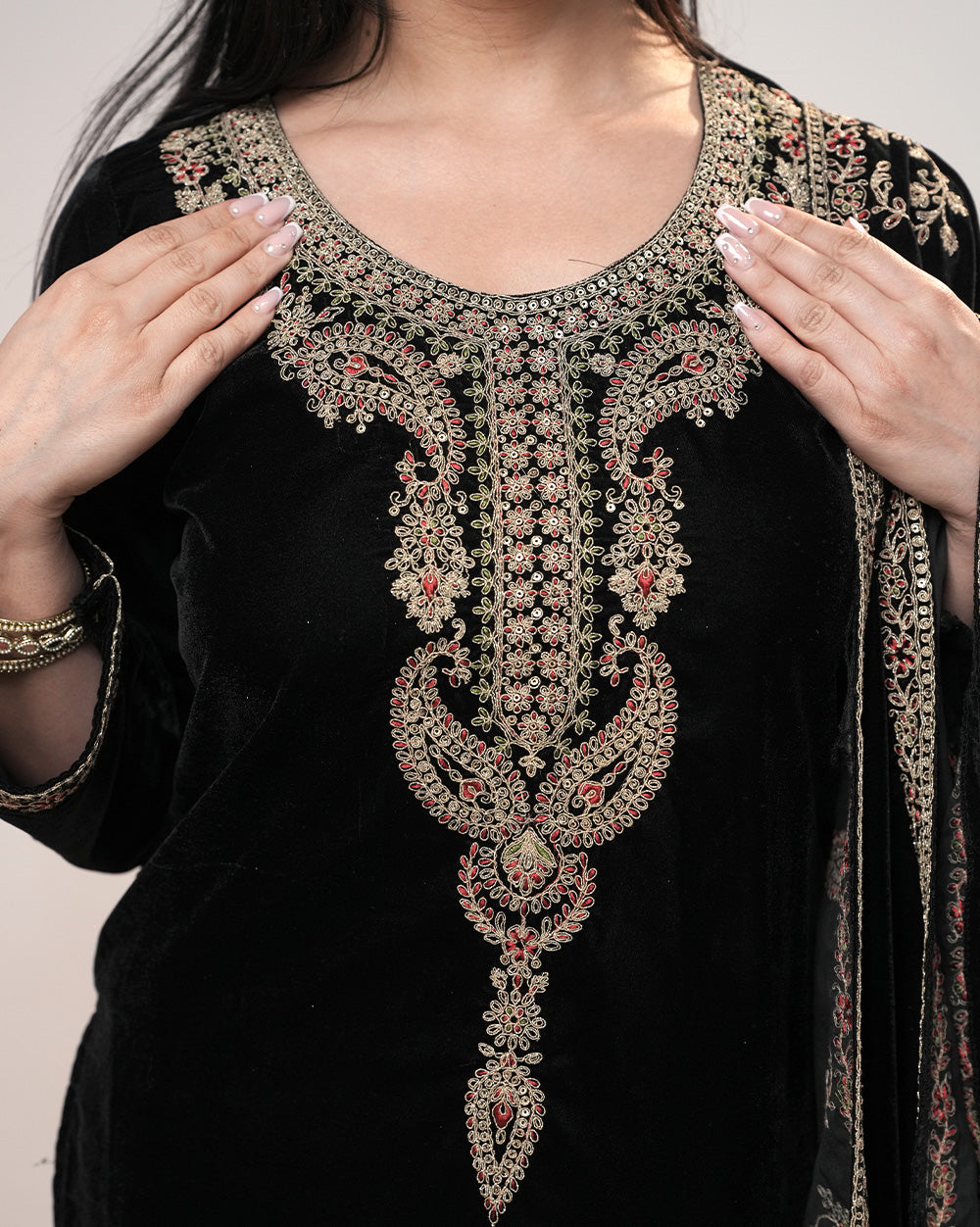 In the Box: Black velvet salwar top with heavy zari embroidery, black velvet normal-fit bottom with laced hem & single side pocket, and velvet dupatta with zari embroidery.