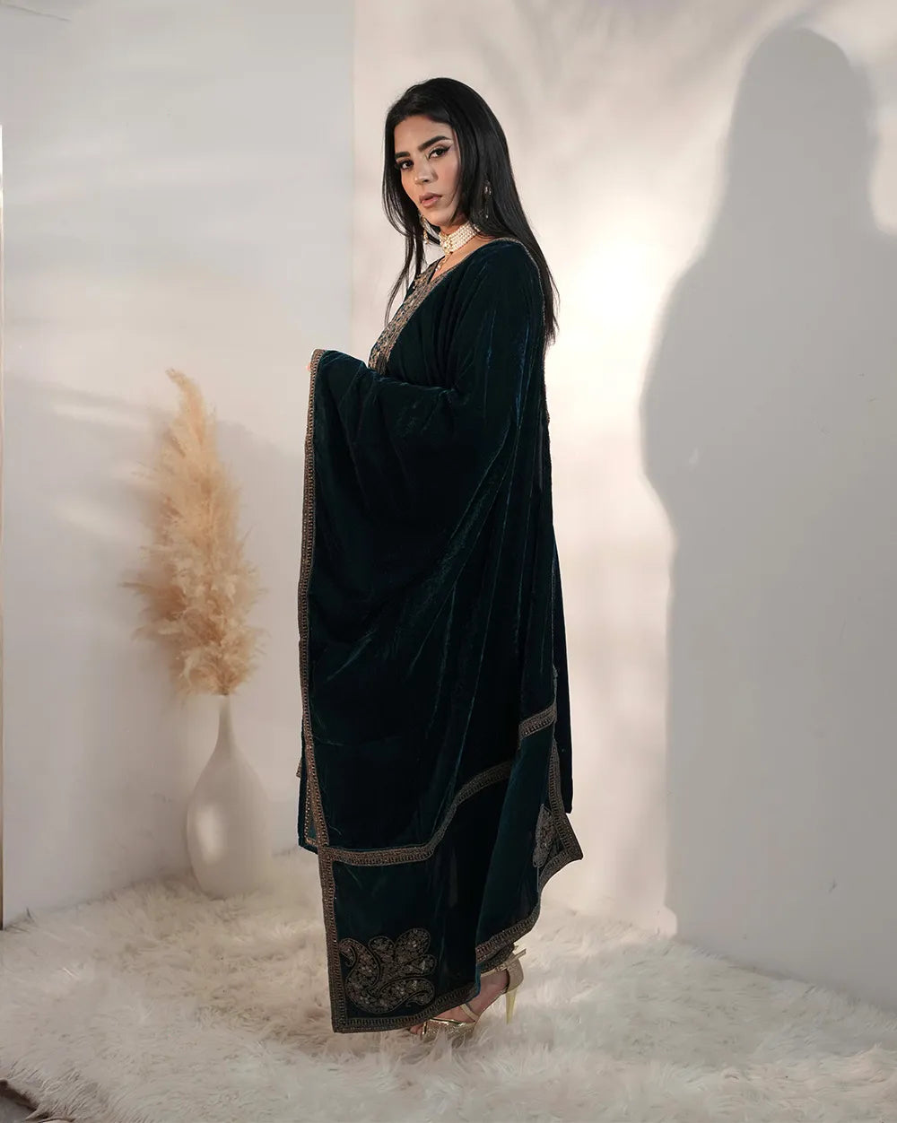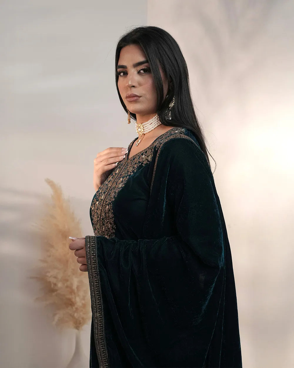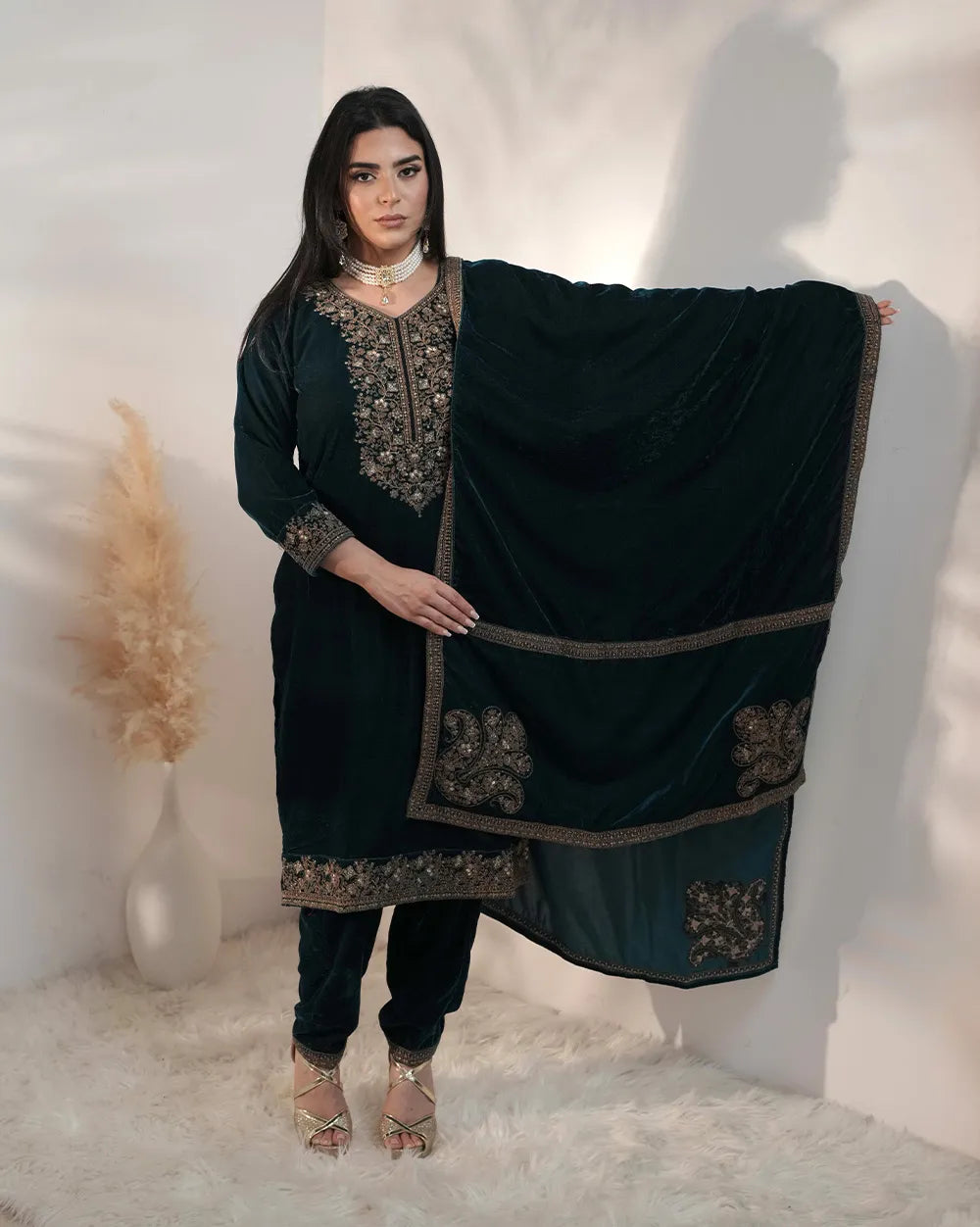 Top: teal blue velvet salwar suit with zari embroidery detailing on yoke, sleeves, and bottom hem.