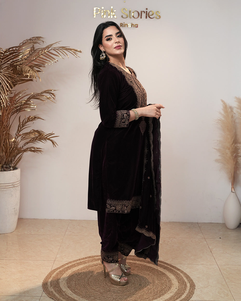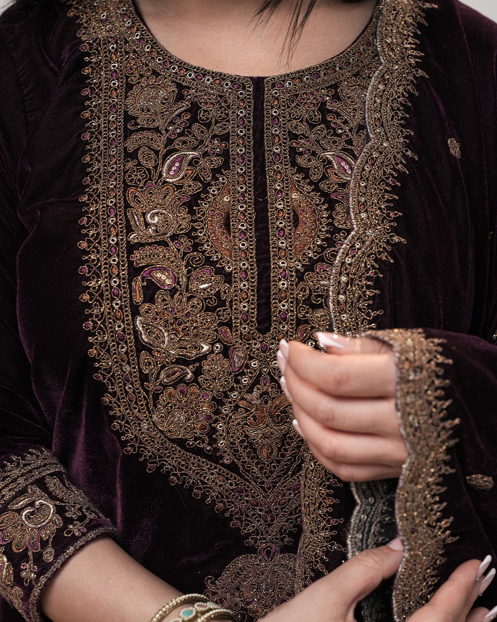 In the Box: Wine shade velvet salwar top with zari embroidery, matching velvet normal-fit bottom with zari hem & single side pocket, and wine shade velvet embroidered dupatta with scalloped borders.