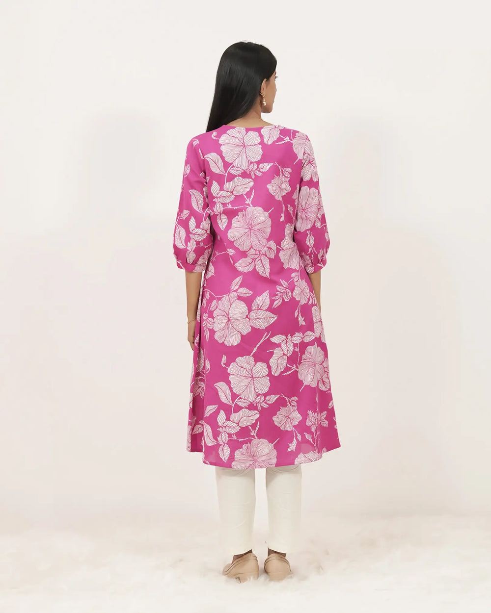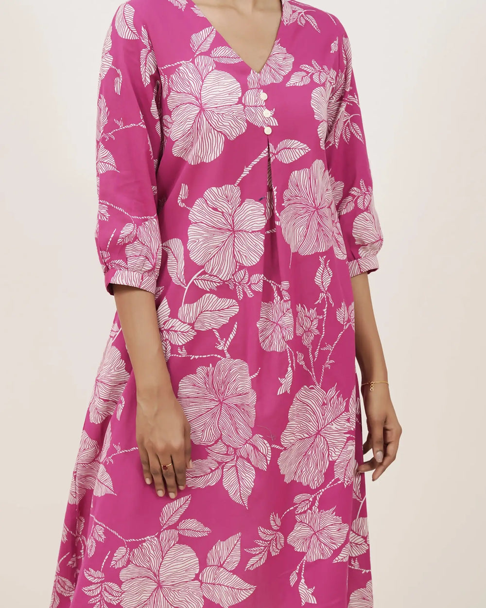 Elegant magenta pink cotton co-ord set featuring a floral printed A-line top with center pleats for a graceful drape. Paired with a versatile off-white normal fit cotton bottom for a balanced and stylish look. Designed with a V-neckline, this co-ord set blends comfort and chic style for casual wear.