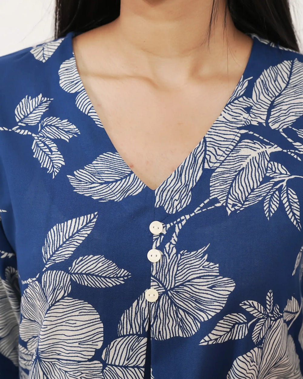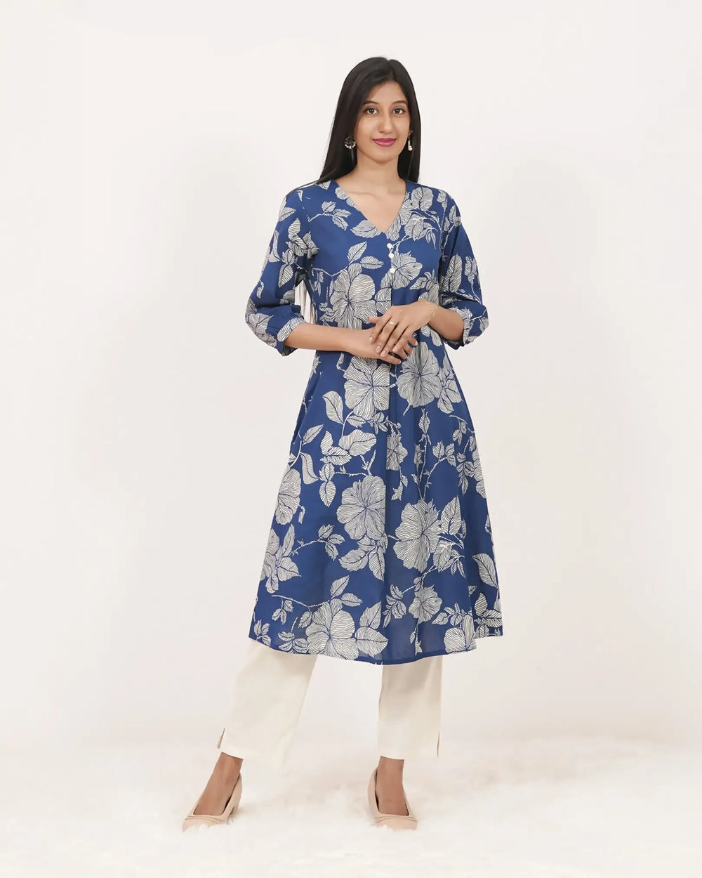 Stylish navy blue cotton co-ord set featuring a floral printed A-line top with center pleats for an elegant flow. Paired with an off-white normal fit cotton bottom for a balanced, everyday chic look. Designed with a V-neckline, this co-ord set is perfect for casual and comfortable wear.