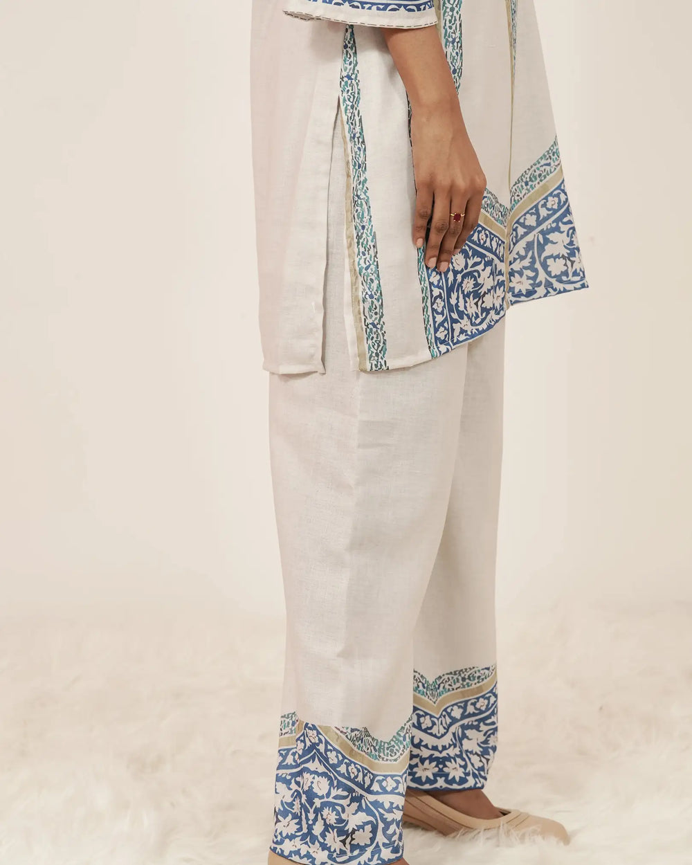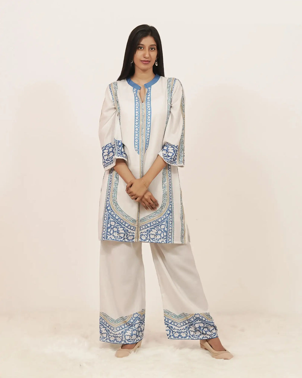 A chic grey linen co-ord set featuring a printed short top with a mandarin collar, paired with wide palazzo bottoms finished with a printed hem. Soft, breathable, and effortlessly stylish for casual wear or semi-formal occasions.
