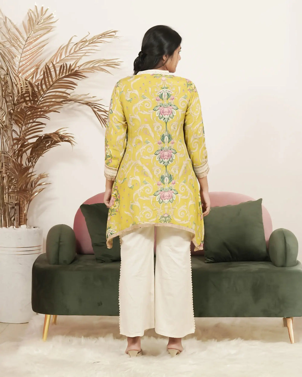 Add a pop of brightness to your wardrobe with this neon yellow floral printed linen short top featuring tassels and lace details, paired with an off-white cotton palazzo bottom designed with elegant laced side seams. A vibrant and comfortable pick for casual outings.