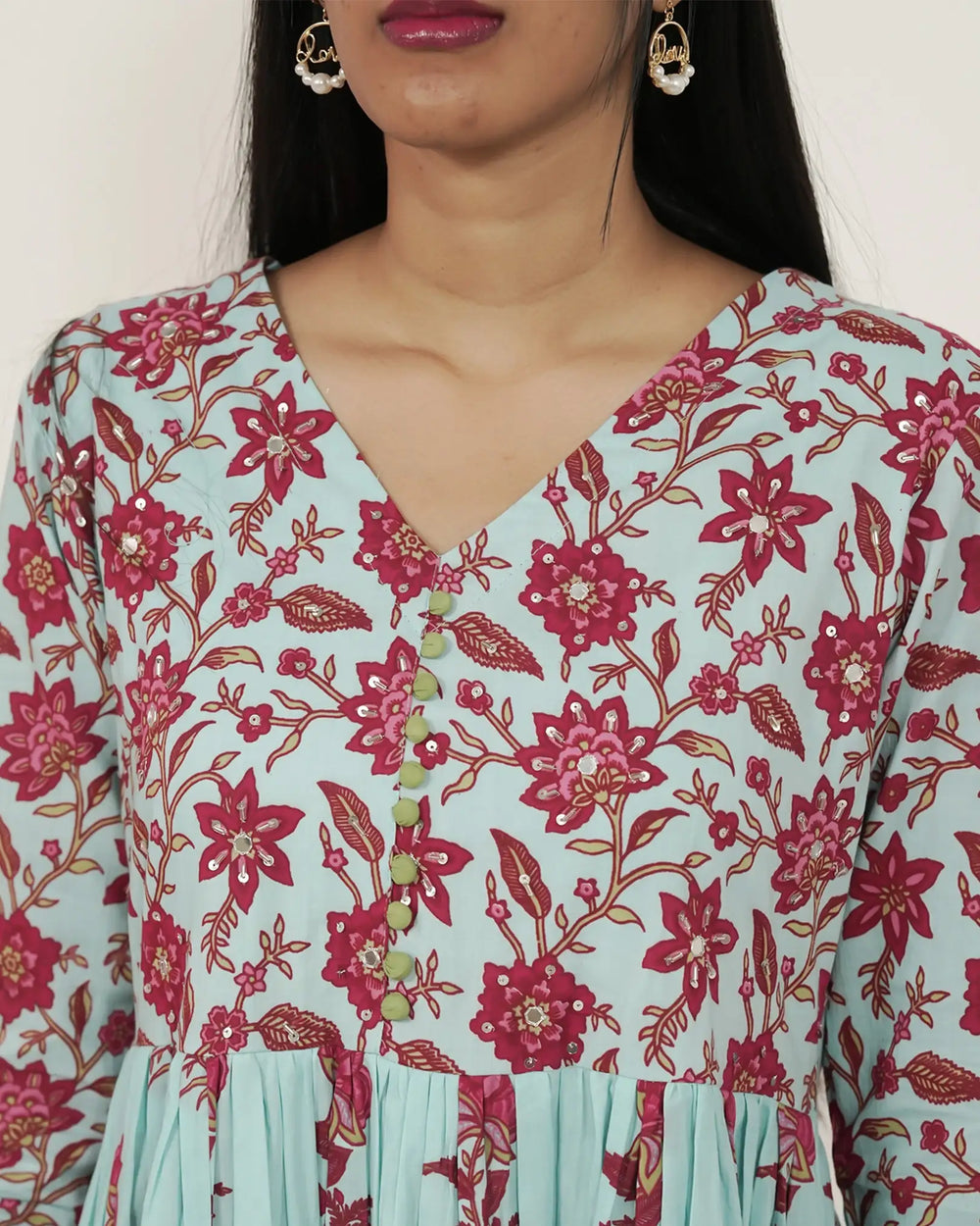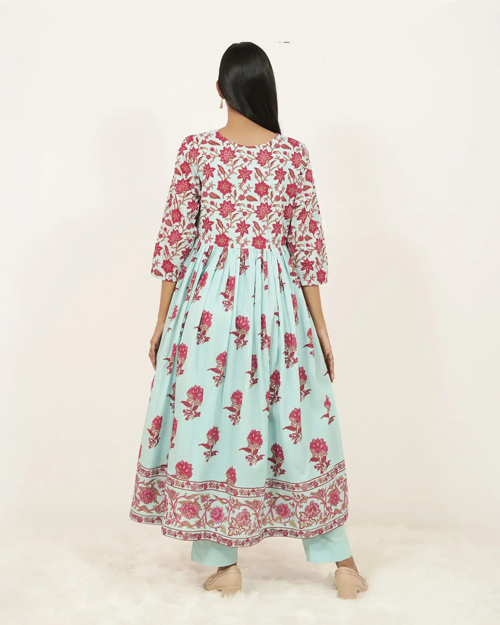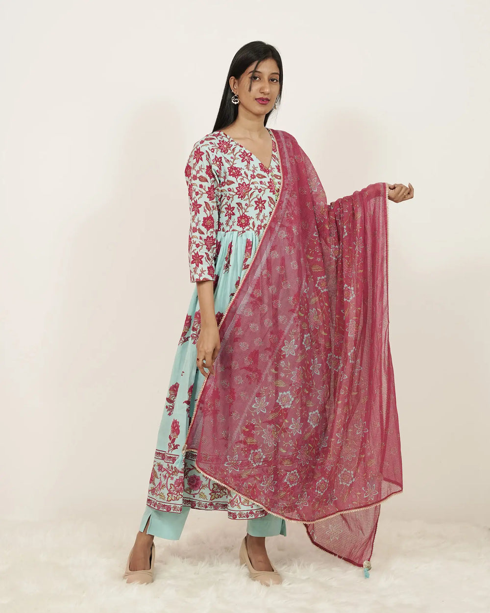 Elegant baby blue soft cotton anarkali set featuring a ruby pink floral printed gathered top, paired with a comfortable normal fit bottom designed with a stylish slit. Completed with a ruby pink floral printed cotton dupatta enhanced with lace detailing and tassels for a refined and feminine look.