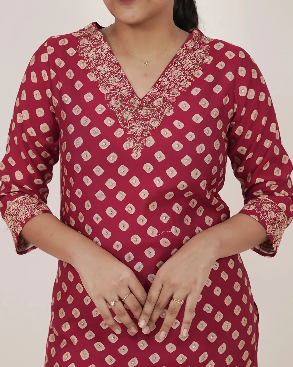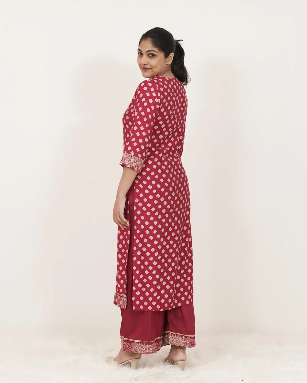 Maroon red muslin silk salwar suit featuring an all-over diamond-dot design and delicate floral embroidery on the V-neckline. Paired with a matching maroon palazzo bottom detailed with an embroidered hem and a maroon multi-printed cotton dupatta finished with thread tassels.