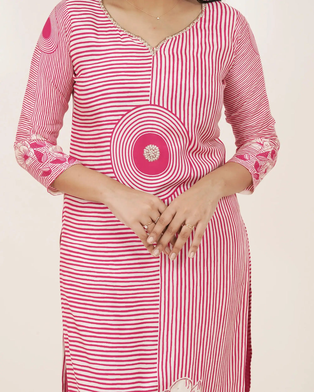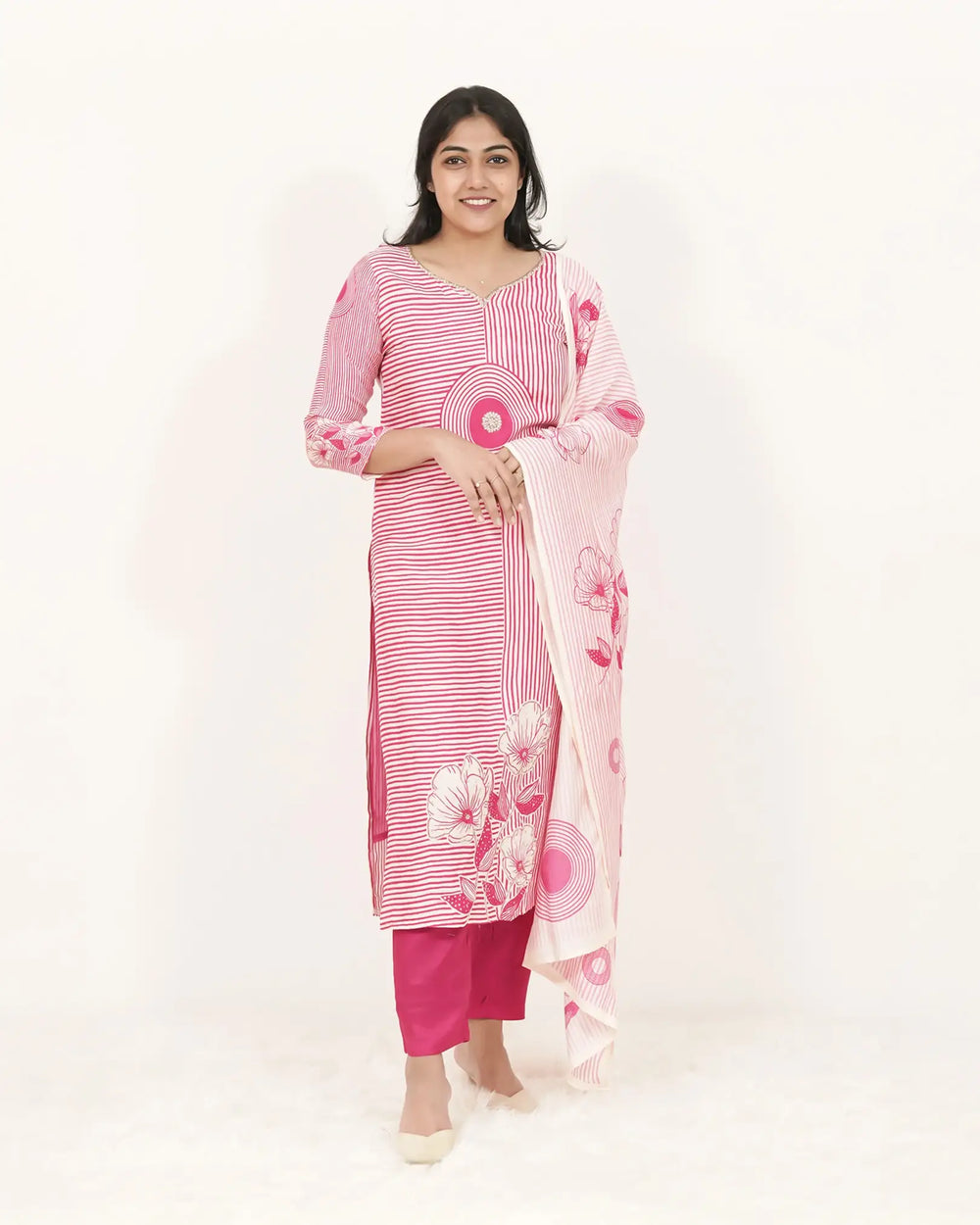 Elegant pink and off-white muslin silk salwar suit featuring a blend of stripe and floral prints, finished with minimal bead handwork. Paired with a magenta pink soft silk normal-fit bottom that includes a functional side pocket, and an off-white muslin silk dupatta decorated with floral prints and light pink stripes. Styled with a round neckline and slit, and completed with plain, top stitch, and overlock craftsmanship for semi-party charm.