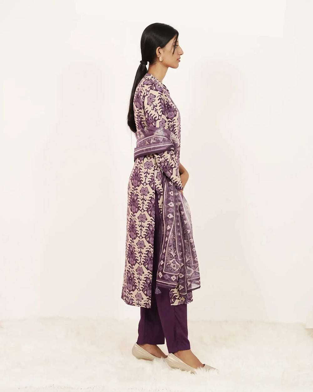 Stylish purple and beige printed salwar set featuring a top with minimal handwork, paired with a comfortable muslin normal fit bottom designed with two side pockets. Completed with a matching printed organza dupatta finished with elegant thread tassels, this set is perfect for casual and semi-formal occasions.